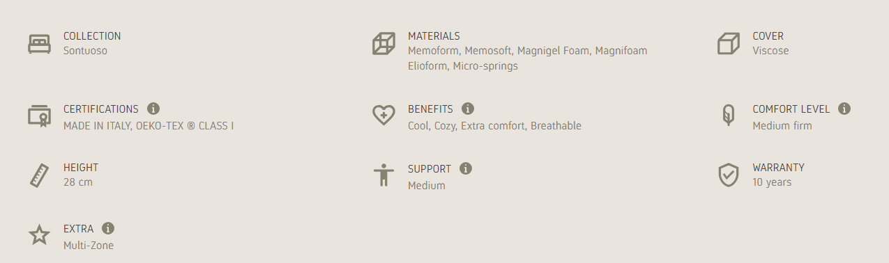Sontuoso Primo 11 embodies all the wealth of a handcrafted tradition and combines it with the high quality materials and the use of the most advanced manufacturing technologies. The art of knowing how to help people sleep in style is authenticated by the elegant signature design and provides a soft support in 28 cm of height.