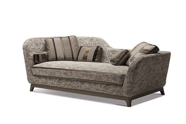With its unique daybed shape, Jeremie recalls the Art Deco style, emphasized by its three variants: “Trendy”, turquoise fabric with special white details and orange base, “Fashion”, in shades of deep pink with floral patterns, striped details and green base, “Glamour”, in elegant taupe and brown colours. Featuring a seat in feather and high resilient polyurethane foam, feather backrest pillows and solid beech wood base in standard wenge finish or RAL color on demand, Jeremie is available in two widths, 214 cm and 228 cm and in several contemporary or classic fabrics. Jeremie is also available in bed version with a 190 cm long mattress.