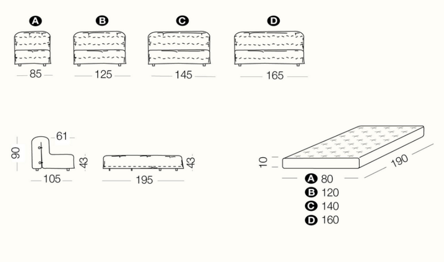 Roger retains a simplicity of line, with an original approach to the detailing of natural wood rings of its quilted covering. Roger has a practical front pull-out bed. Covers are completely removable and can be dry cleaned. Roger has a mattress made in undeformable foam covered with a quilted fabric. Roger can be put together with a headboard with a removable cover, washable according to the fabric chosen.