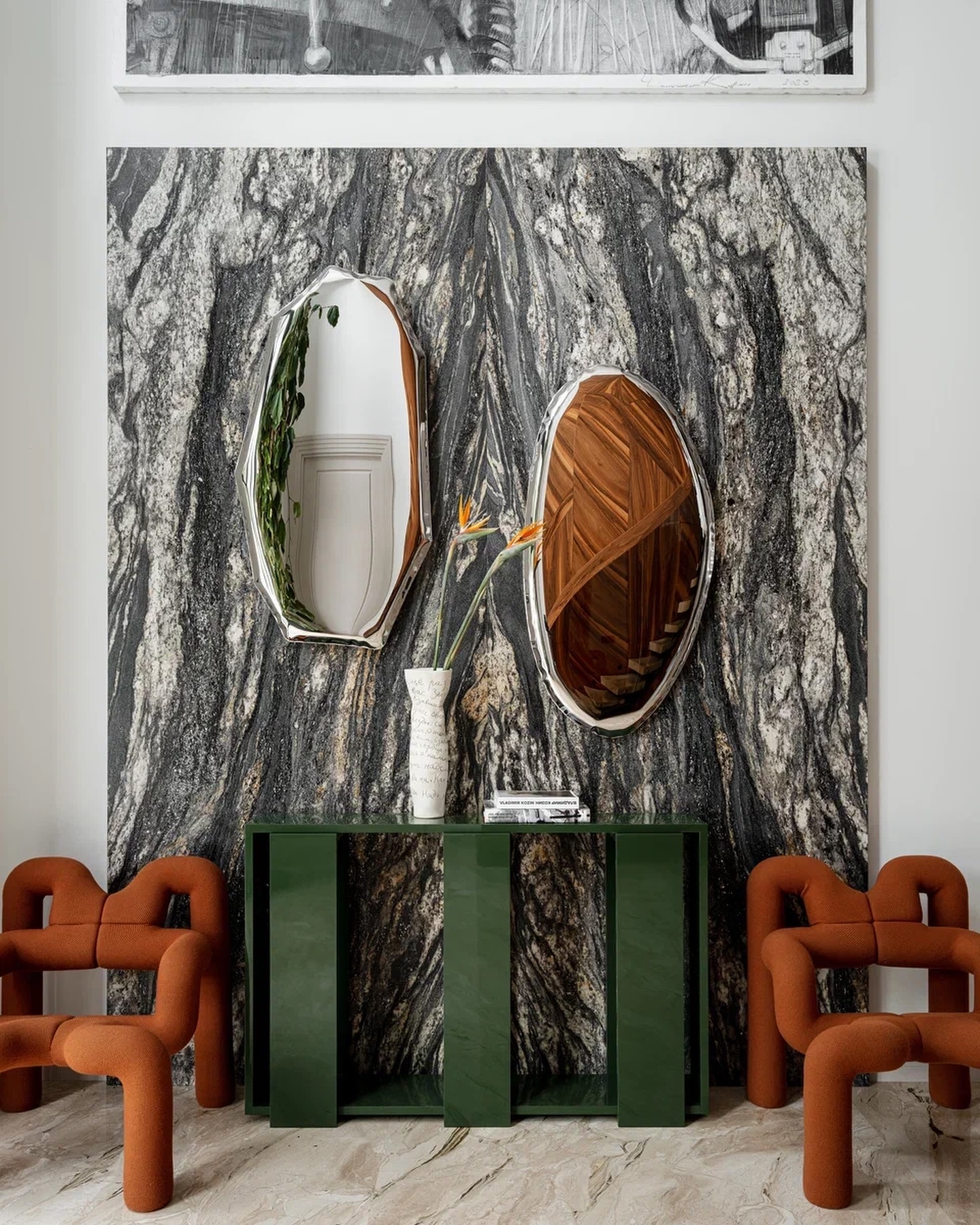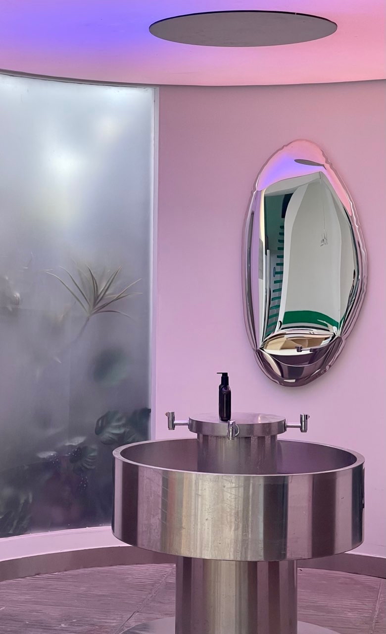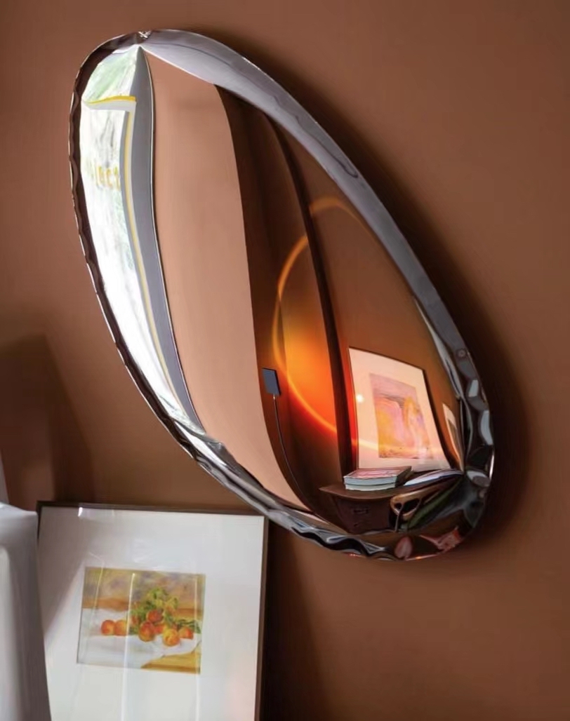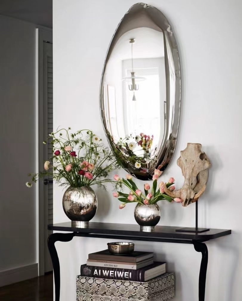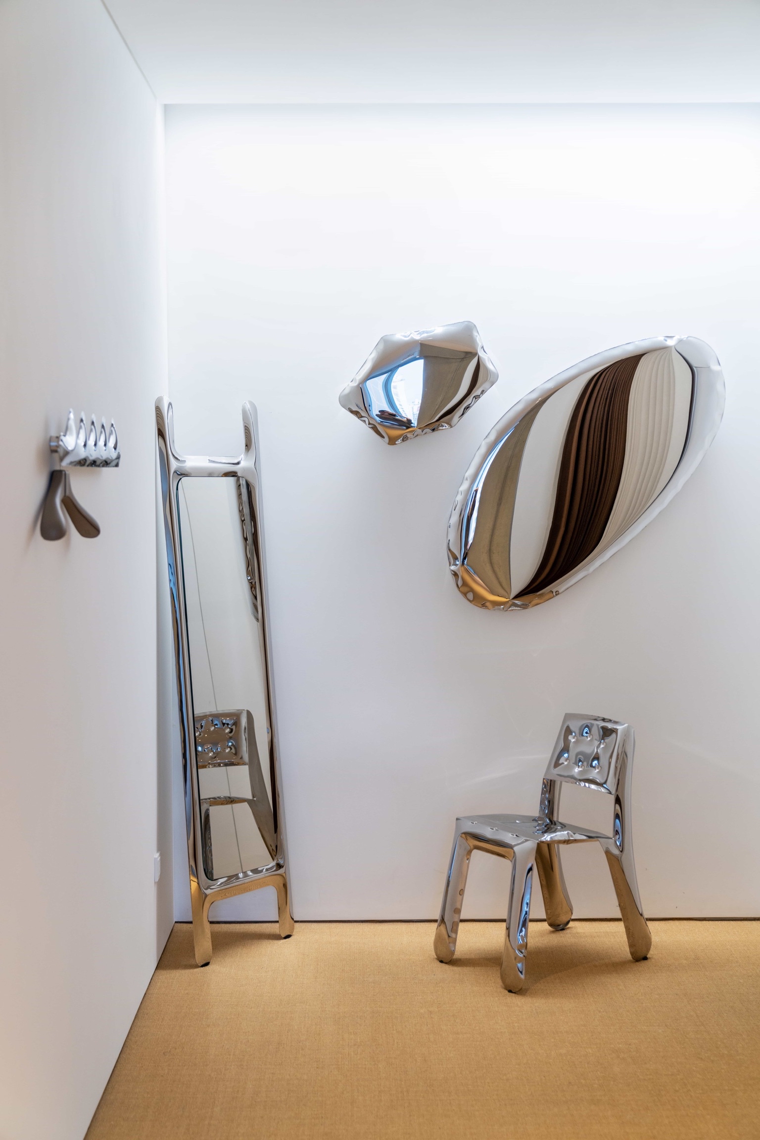 TAFLA O is a series of bionic mirrors of organic shapes inspired by natural shapes of liquid drops. Mirrors from the TAFLA collection are made of stainless steel polished to a high gloss and come in seven different sizes. They can be arranged in an artistic personalized composition or exposed on a wall as a single sculpture-like mirror. They will fit contemporary private spaces, as well as restaurants, bars and hotel rooms. You can enjoy the charm of the classic Inox finish or a colour selected from the available palette. The TAFLA O mirror looks mesmerizing as a single object, but also in layouts that make up constellations of them.