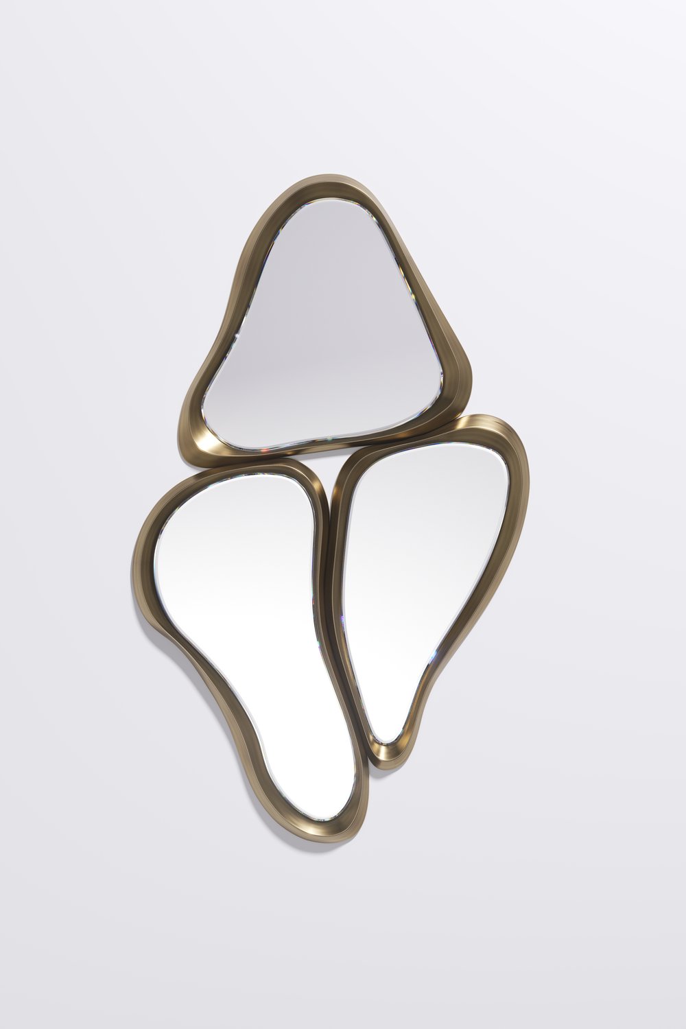 The Mask mirror is a statement and versatile piece. The 3 piece amorphous mirror melt into one another to create a fluid and dramatic expression. The frame is inlaid in either shagreen or pen shell with bronze-patina brass.This piece is designed by Kifu Augousti, the daughter of Ria and Yiouri Augousti.