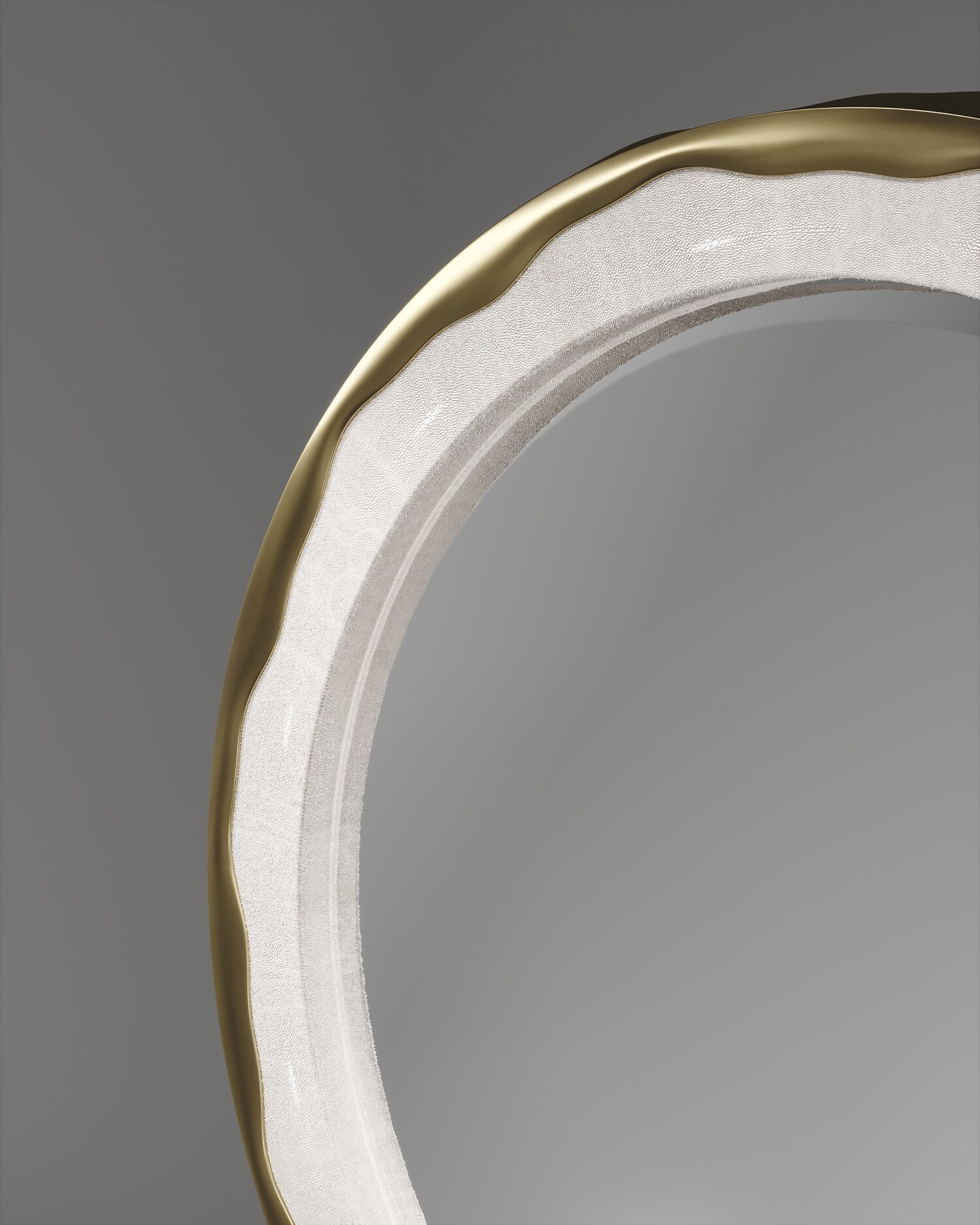 The Melting Mirror by R&Y Augousti in cream shagreen and bronze-patina brass, is an iconic piece of theirs with their signature "melting" metal detail. Available in other finishes and a large size, as well as a "cut out" version.