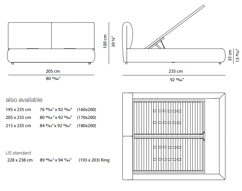 Bed with container unit. Base and headboard in MDF upholstered with regenerated and regenerable polyester balls. Aluminium varnished steel springing frame. Suspension in natural bent beech strips. Internal regenerated and regenerable polyester fabric; removable fabric cover. The bed fitted inside the base, is furnished with a container unit accessed by lifting the springing with a special device.