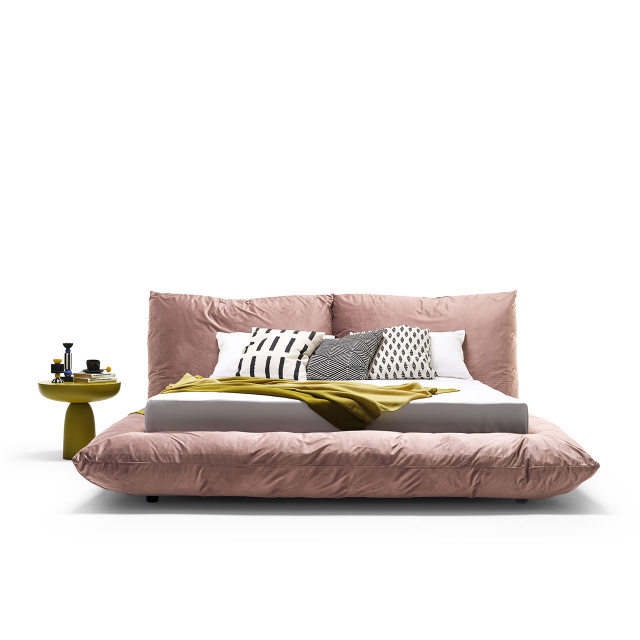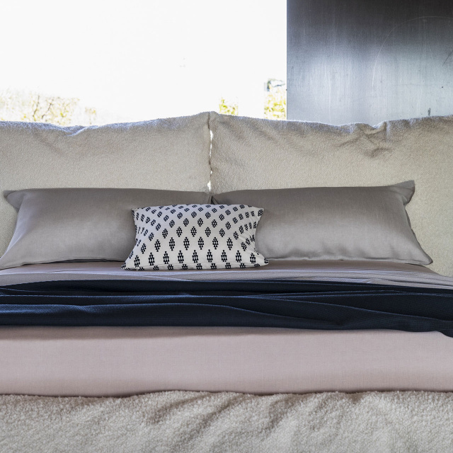 Double bed with upholstered structure characterized by soft lines, large, comfortable and reassuring volumes. Undisputed protagonist of the sleeping area. The extreme simplification of the bed element, the cushions, usually accessories become load-bearing elements, taking unique shapes and folds with continuity and harmony.