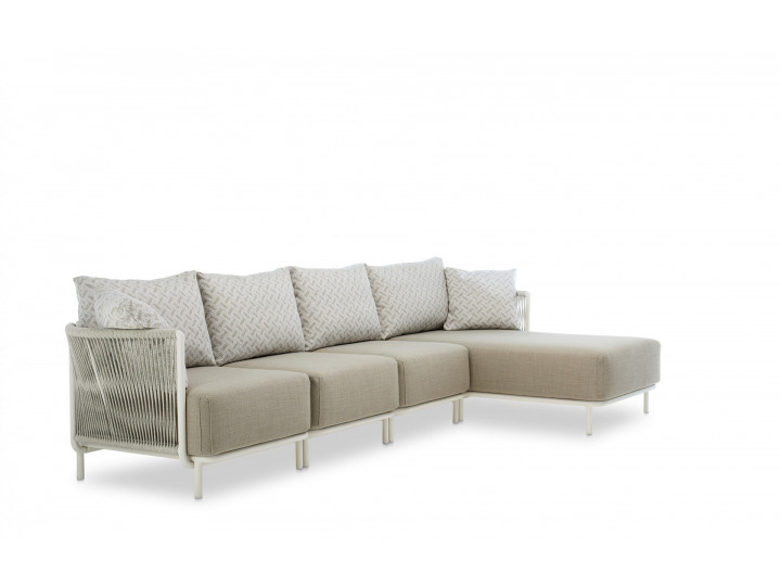Divano in acciaio 304 verniciato a polveri, intrecciato con Flat Trendyrope. Un divano accogliente, dove la particolare geometria dello schienale si coniuga perfettamente al desiderio di comfort,  creando un angolo per vivere momenti di relax. Ottimo per arredare terrazzi e patio, dona forte personalità anche alle zone living interne. Ideale per arredamenti residenziali e contract.