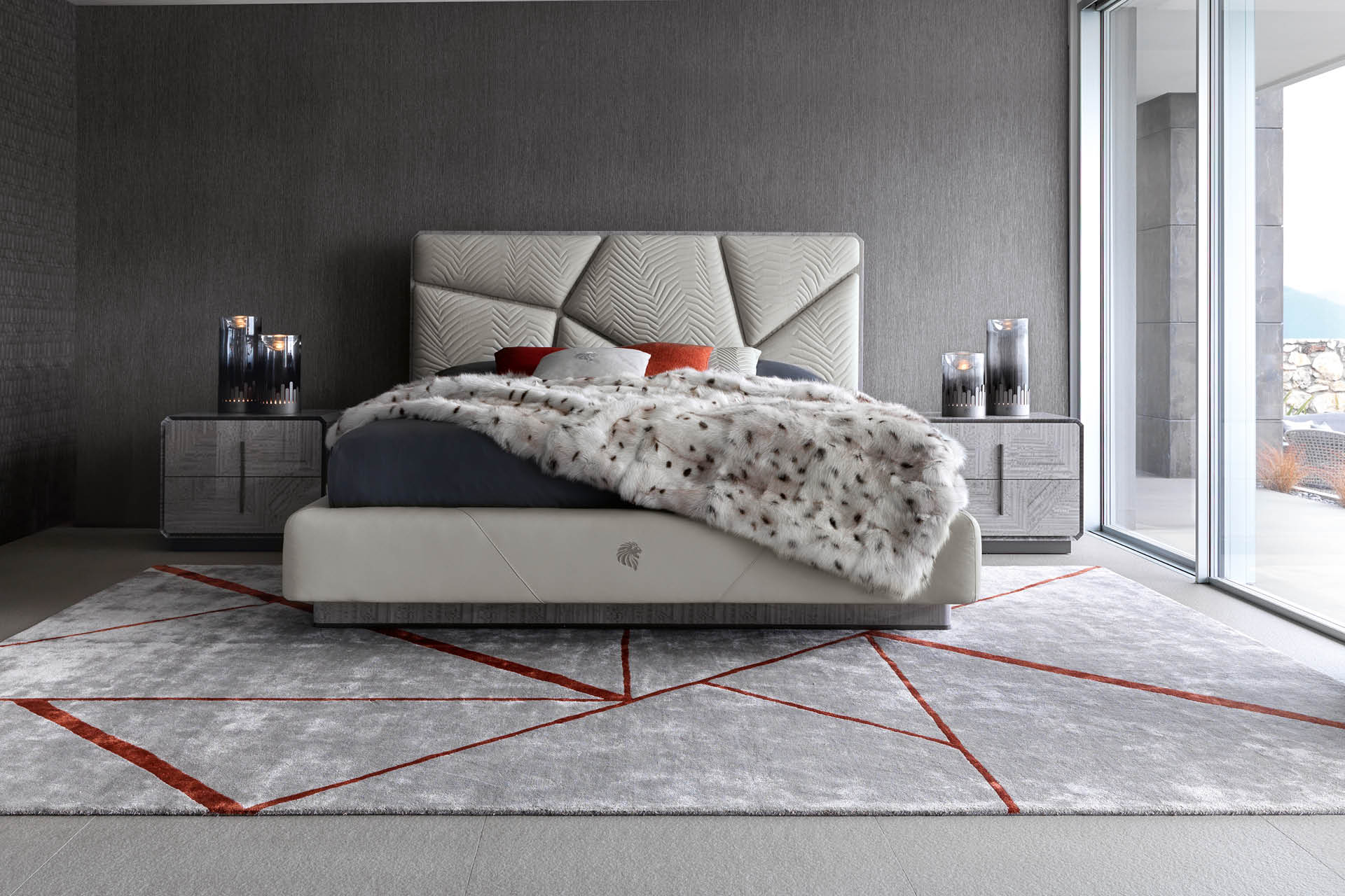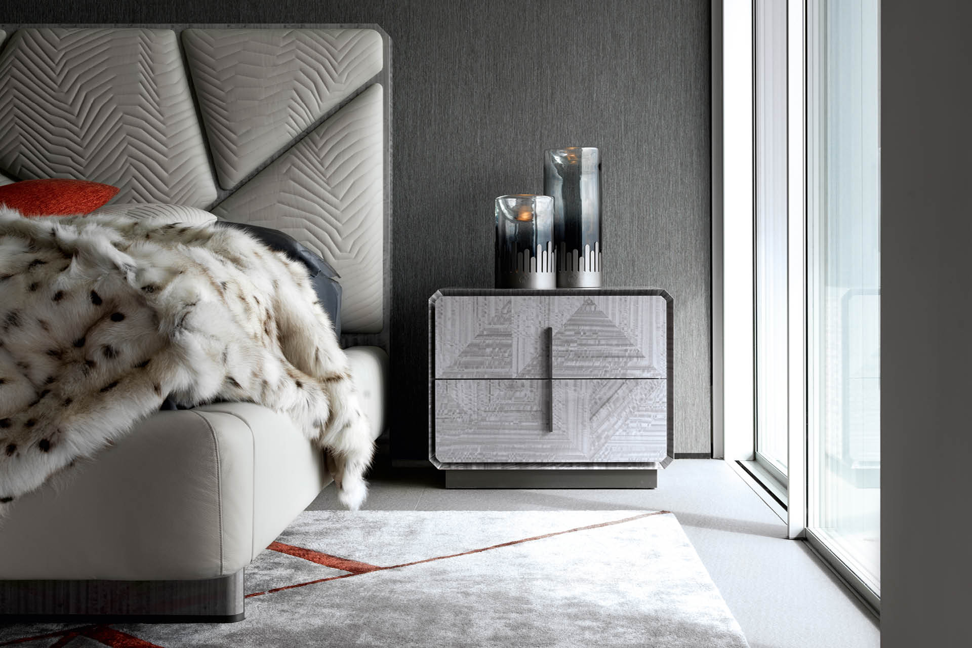 Night table in inlaid Tasmanian curly Eucaliptus veneer with high gloss polyester finish. 2 full extension drawers with bottom part in velvet fabric. Base and handles in satin grey nickel stainless steel. Top and sides with insert in satin grey nickel stainless steel.