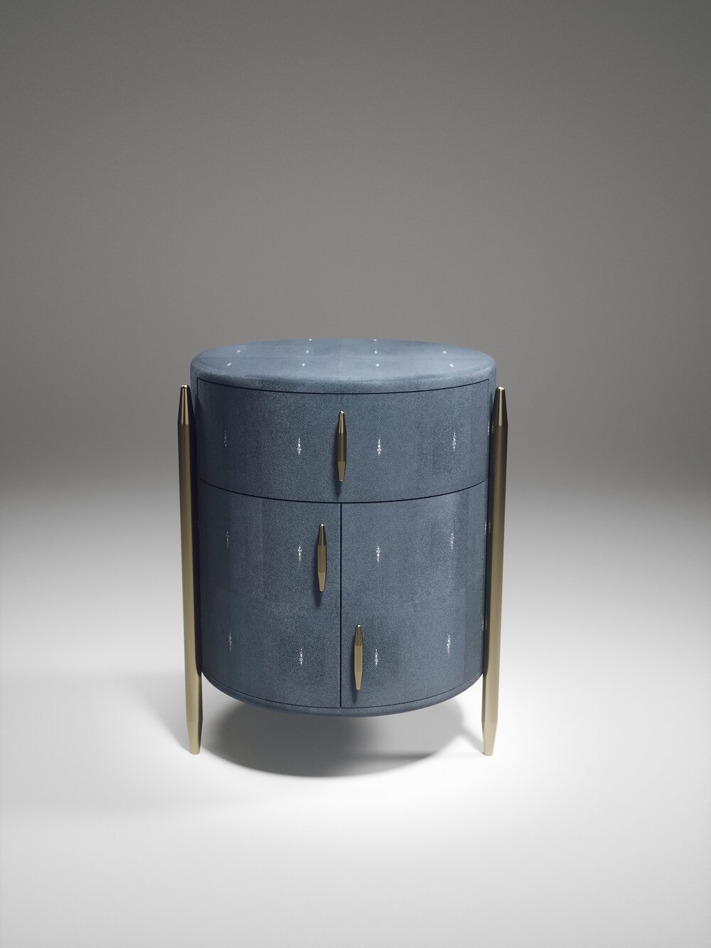 The Dandy Round Bedside Table by Kifu Paris is an elegant and a luxurious home accent, inlaid in cream shagreen with bronze-patina brass details. This piece includes 1 drawer total and a cabinet below; the interiors are inlaid in gemelina wood veneer. Available in other finishes and as a square version. This piece is designed by Kifu Augousti, the daughter of Ria and Yiouri Augousti.、