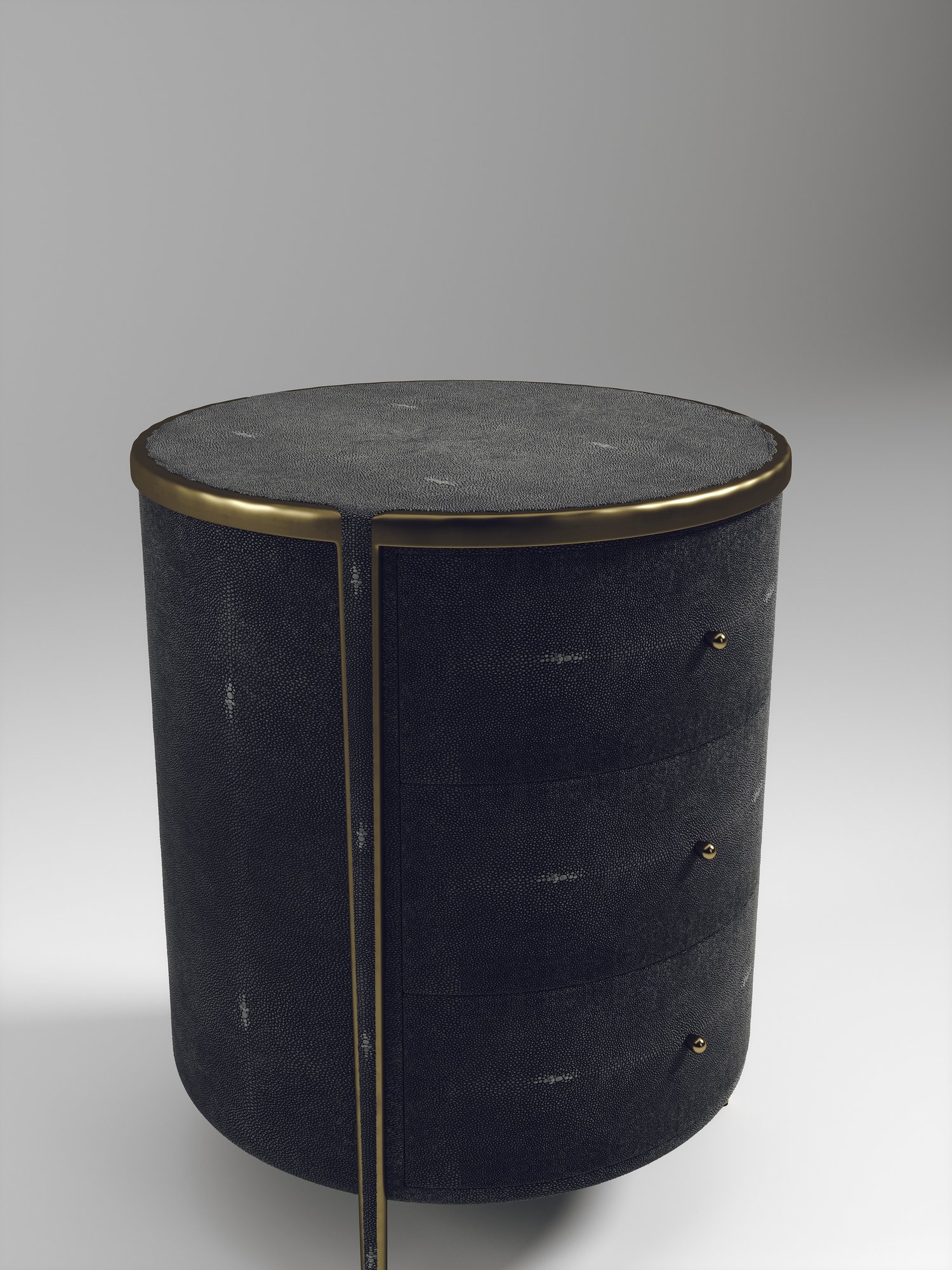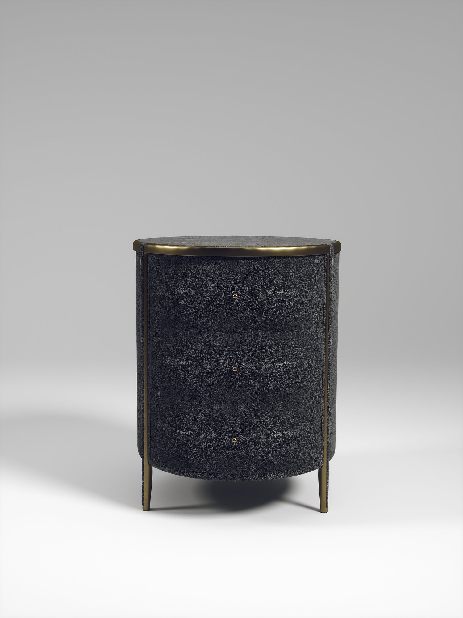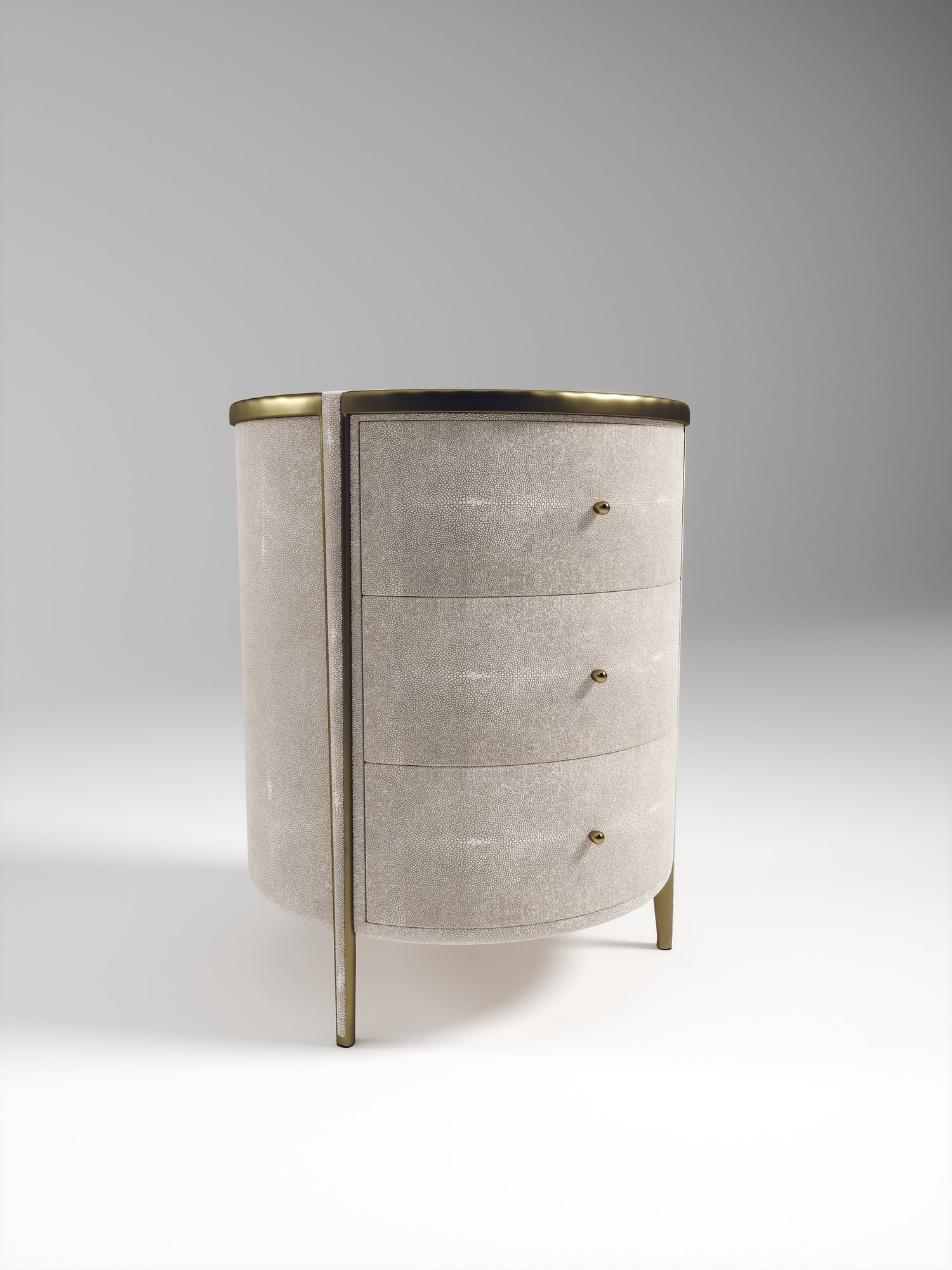 The Melting Round Bedside Table by R&Y Augousti is an elegant piece for any space. The cream shagreen inlaid piece is classic, but accentuated by their signature organic melting bronze-patina brass frame. This side table includes 3 drawers. This piece is part of the Melting Capsule. Available in other finishes.