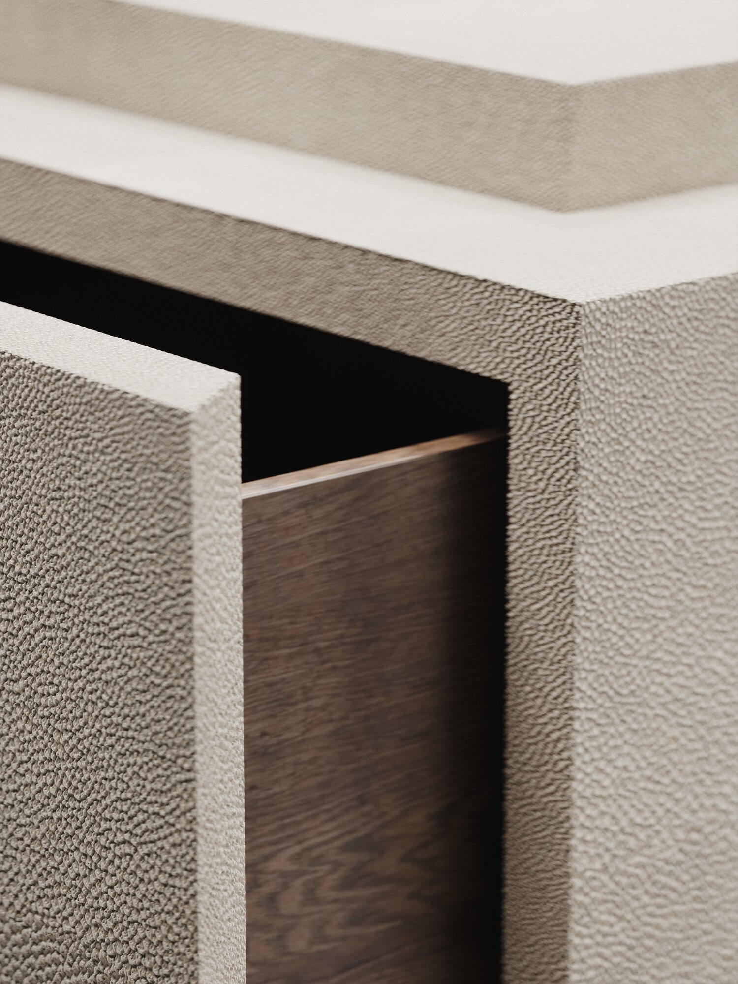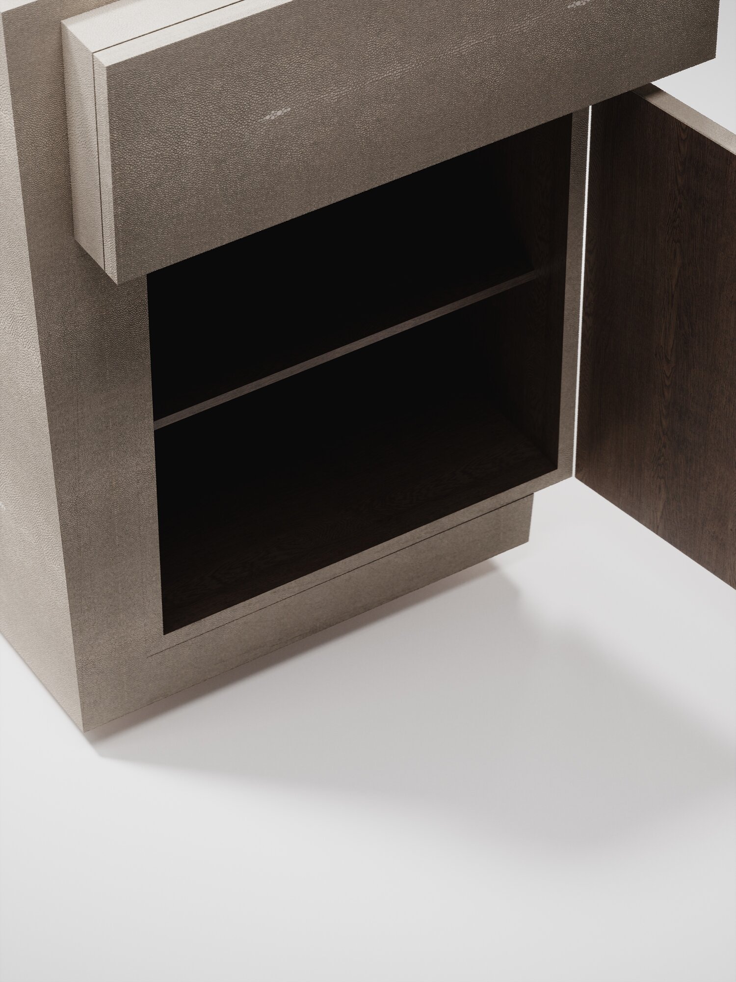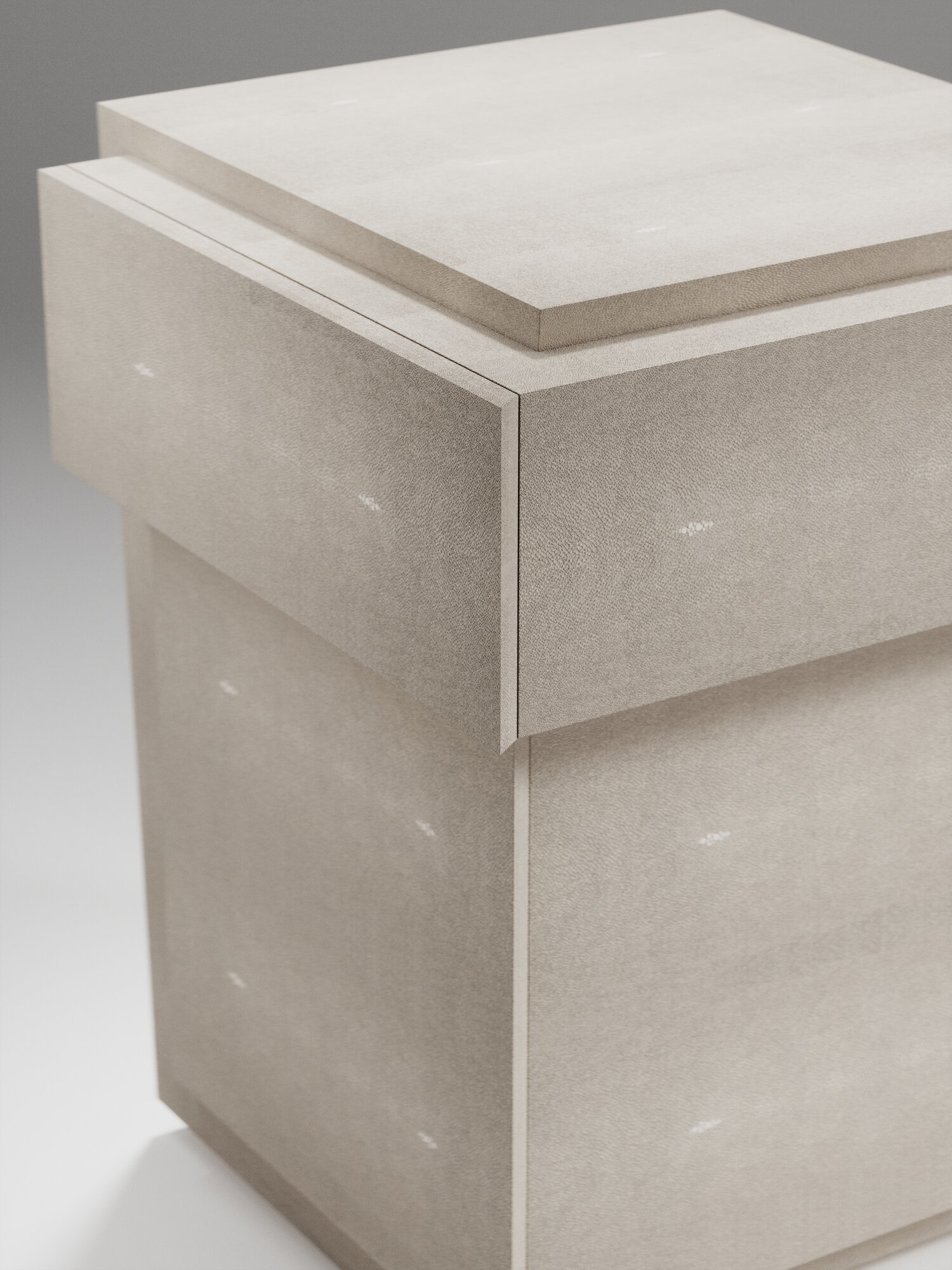 The Pablo night stand by R&Y Augousti is an elegant piece with its fun geometry. This bedside table is completely inlaid in cream shagreen and sits on a discreet inset shagreen plinth. This bedside table includes one drawer and a lower cabinet underneath the drawer with two shelves.