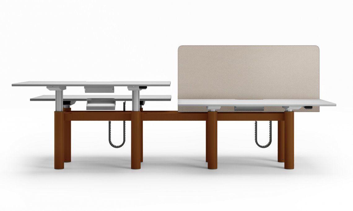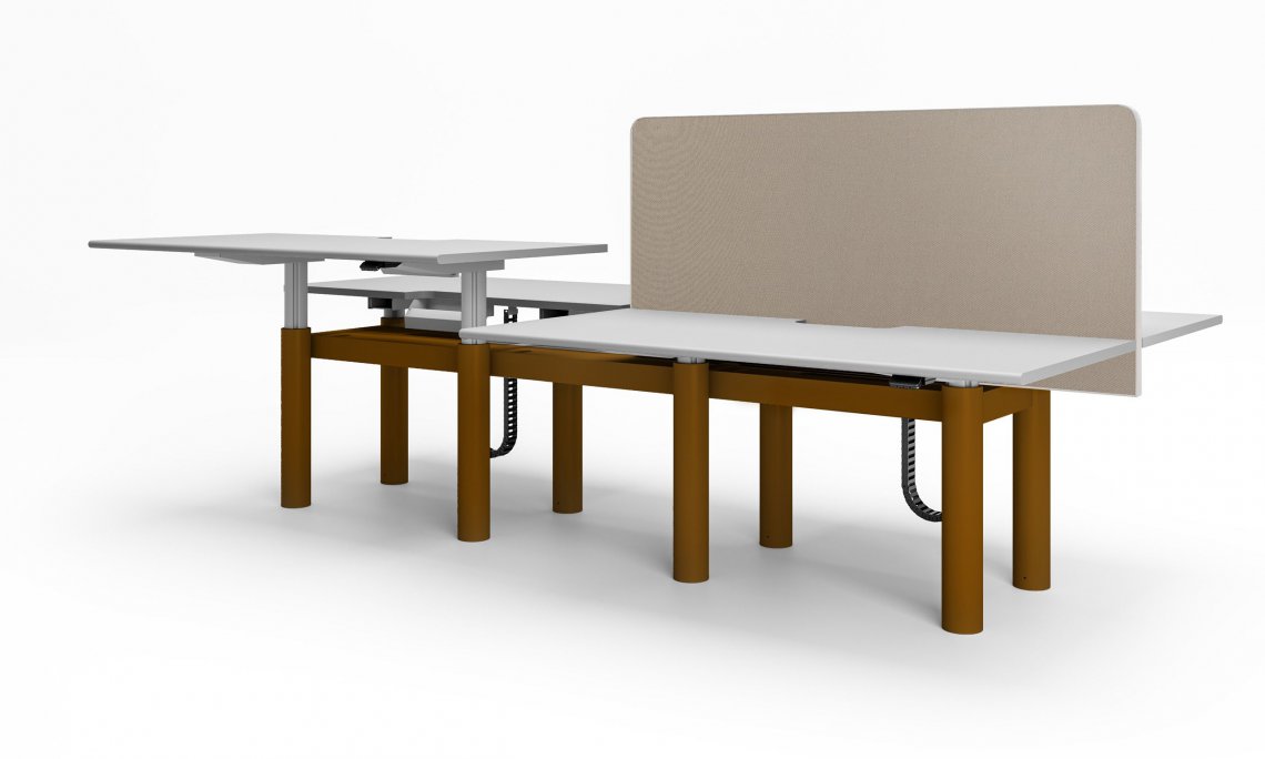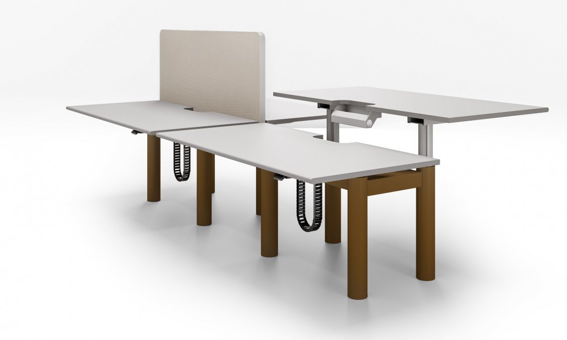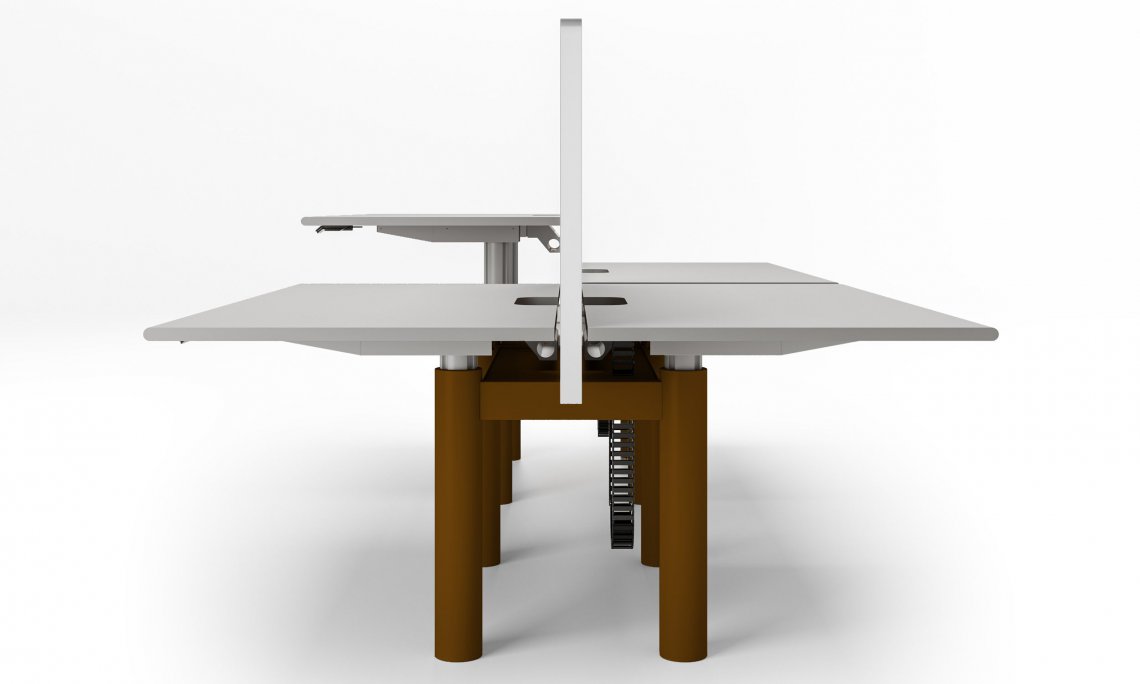 Galleria is a bench desk system with height adjustable desktops, designed for either fixed desk or co-working spaces. Perfect in open-plan offices to enable the optimum use of space. The dividing panel ensures privacy - both visual and acoustic - making it easier for the worker to concentrate. Round legs support the aluminium structure. A tray beneath the desktop gathers the cables and keeps them organised, whilst smaller trays are also available for the power strips. The height adjustable desk top is available in melamine, wood or lacquered.