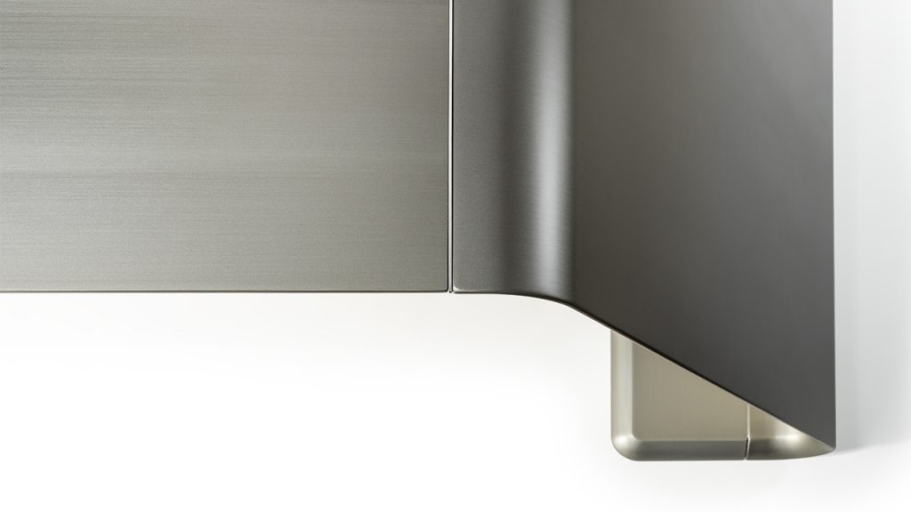Pannello frontale rivestito in pelle trapuntata. Supporto in cromo lucido con foro passacavi.