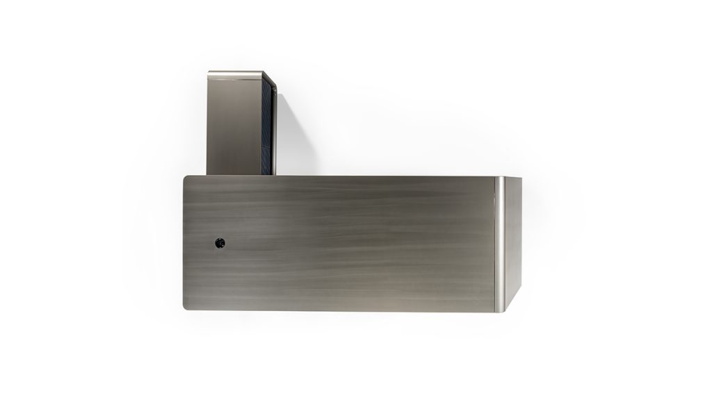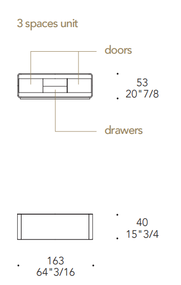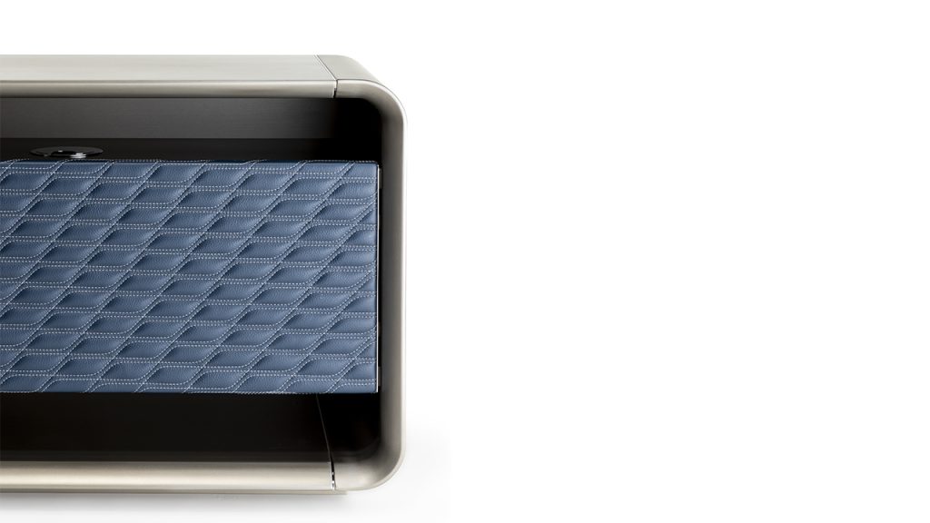 Cassettiera laterale con struttura in legno in ottone (104M), ottone dark (105M), titanium (101M) con 2 cassetti e 2 ante rivestiti in pelle trapuntata (in tinta con pannello).