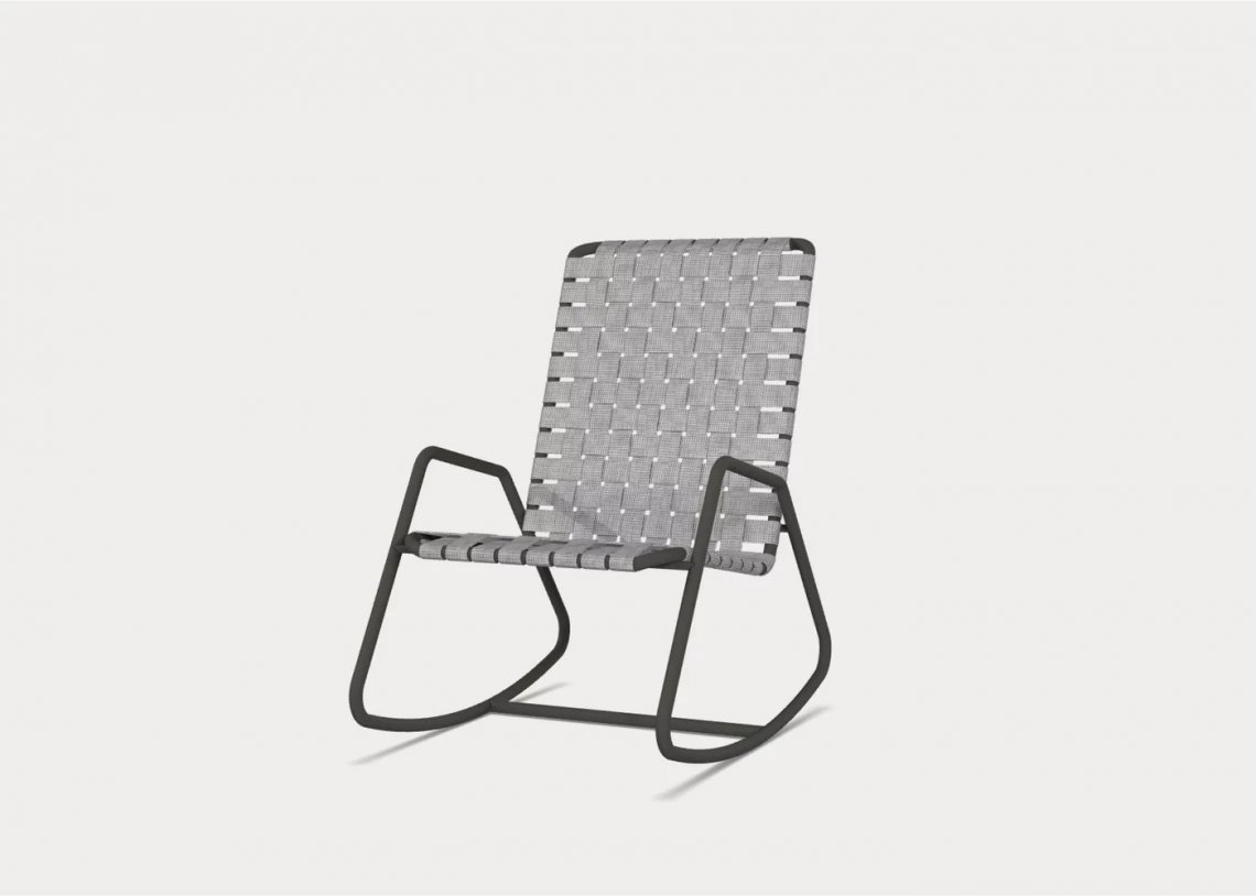 La struttura essenziale e minimal a vista denota il dondolo Inout 809 che si sviluppa attorno ad una leggera struttura in tubolare di alluminio verniciato goffrato in Pearl, Oxido, Agate o Slate. Materiale ecologico ed unico per qualità tecniche, evidente nelle gambe di forma trapezoidale. A questo si aggiunge un particolare intreccio in cinghia elastica grigia, nera, blu, tabacco, un prodotto innovativo a base di gomma sintetica e propilene.