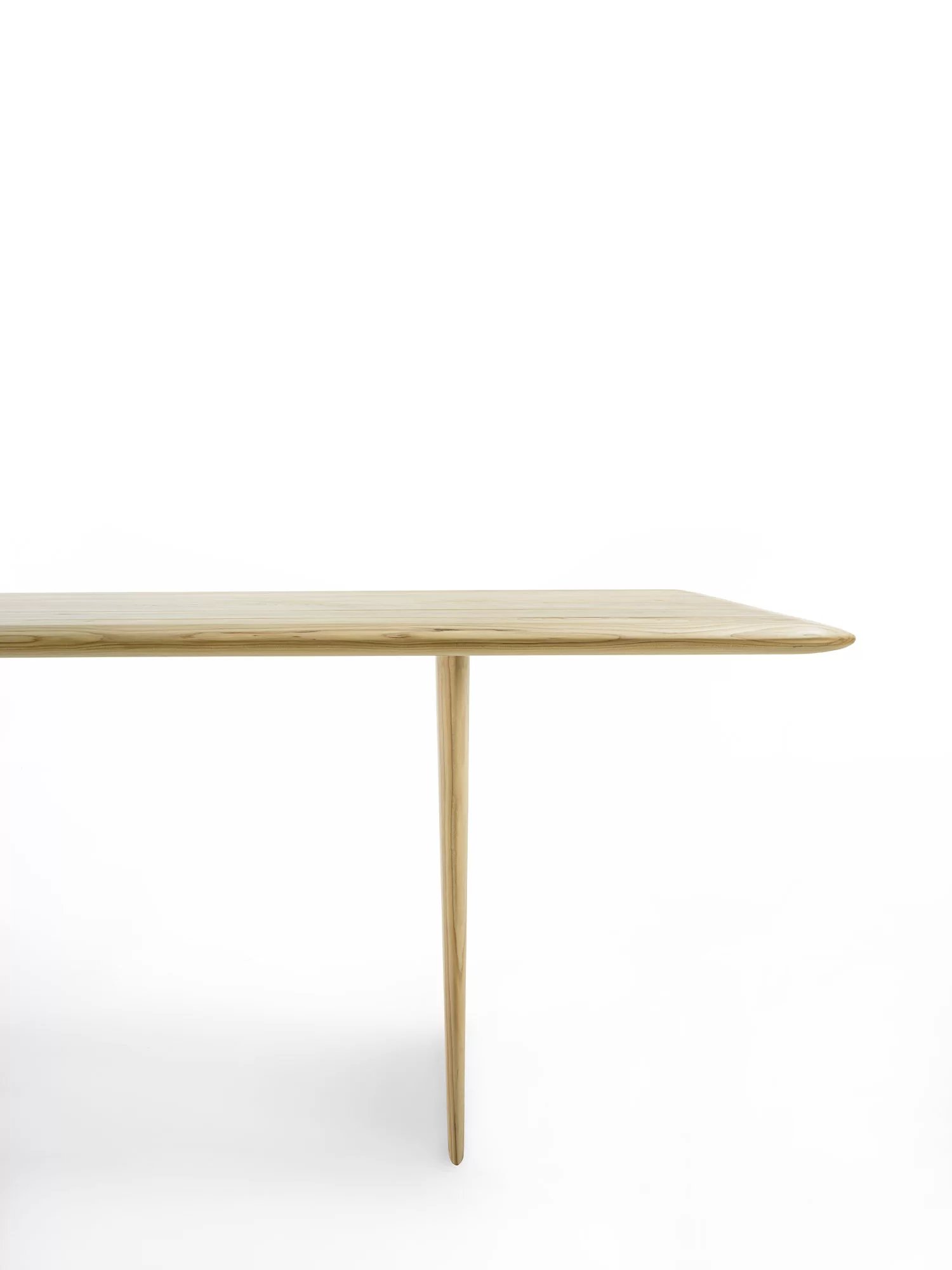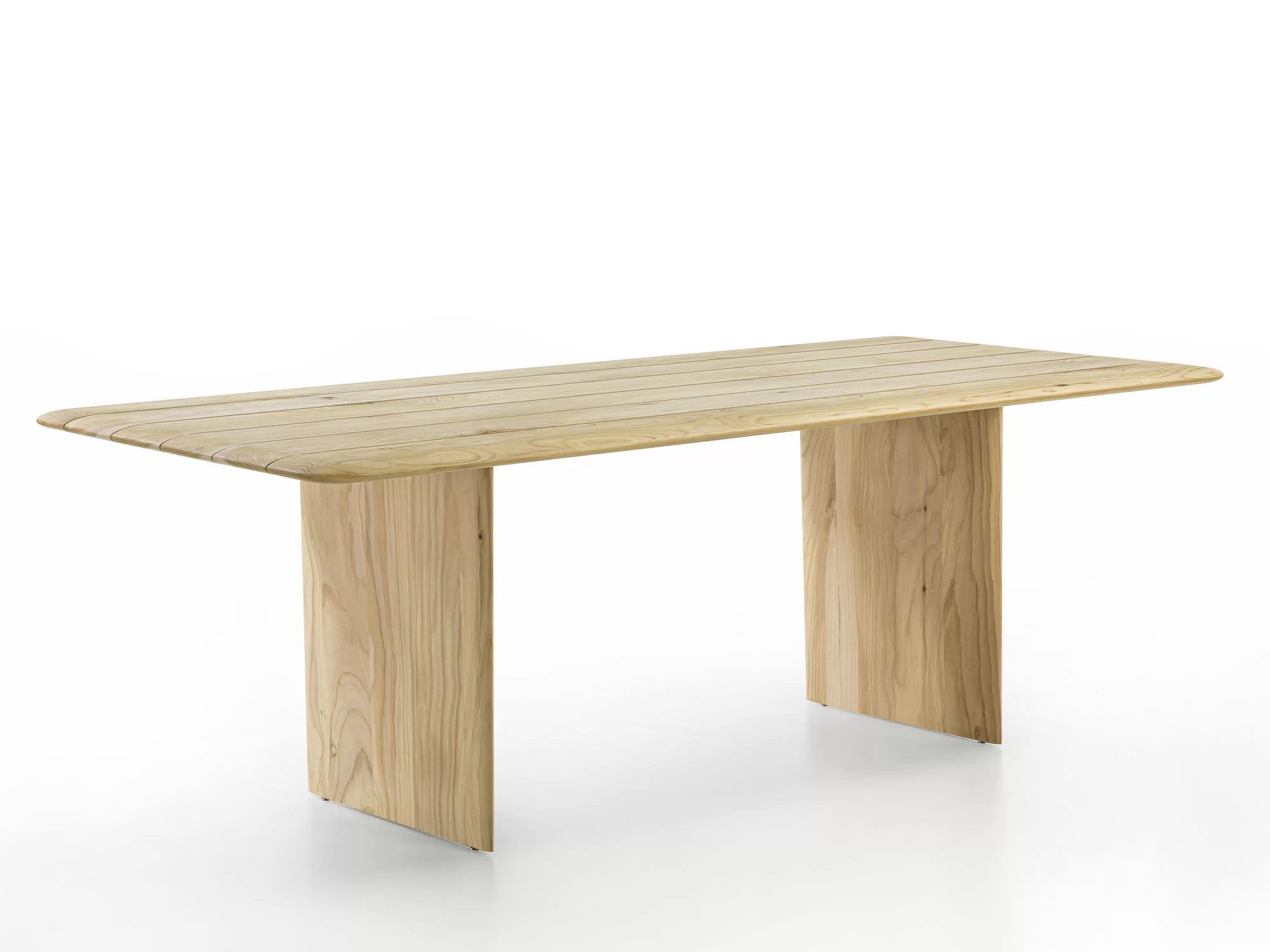 Versione per outdoor in legno massello di cedro profumato del Libano, con i classici lati stondati e caratterizzato da top e gambe con spessori assottigliati tramite lavorazione a saponetta, che donano leggerezza e sinuosità; inoltre il top è costituito da liste accostate.