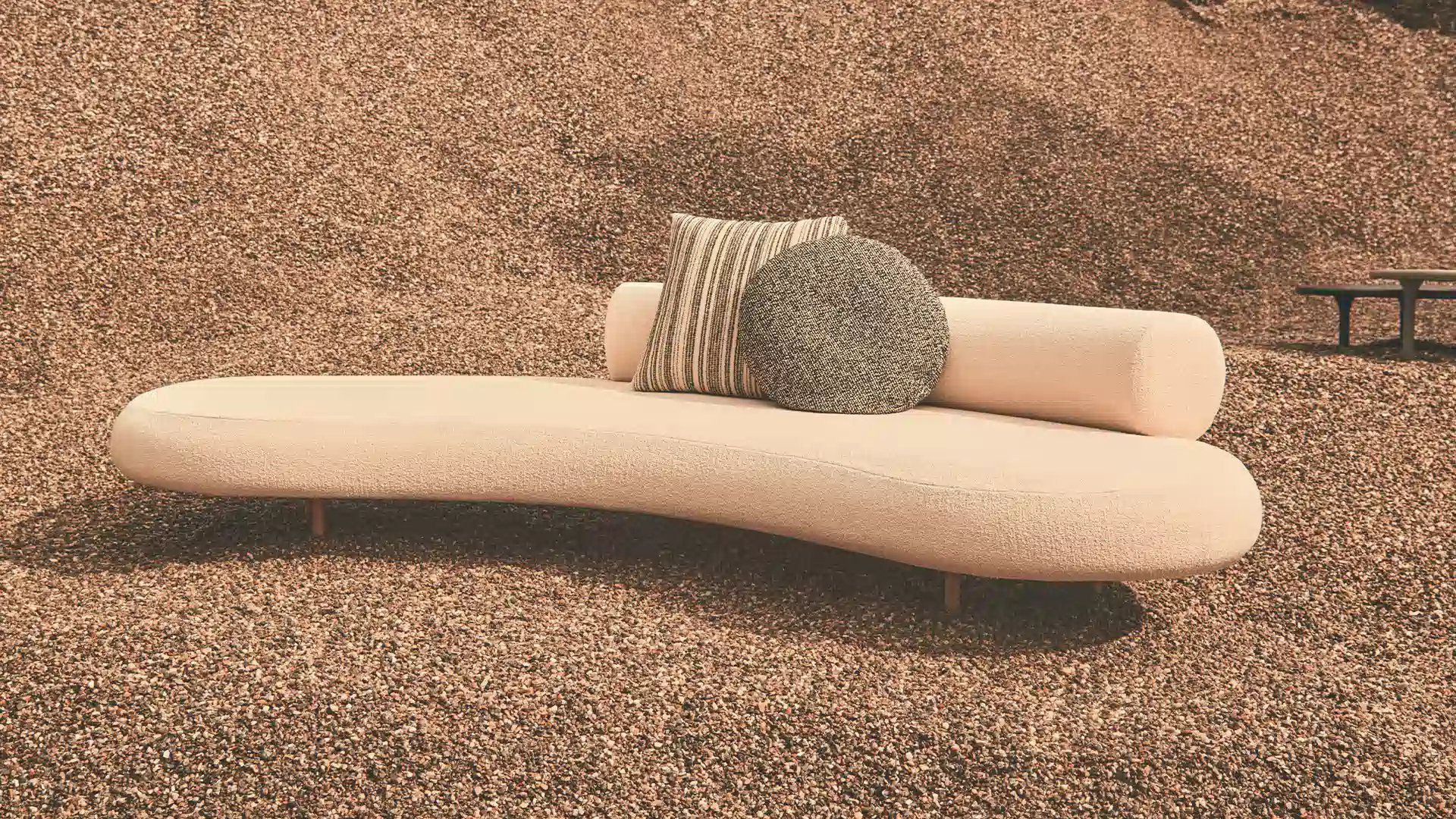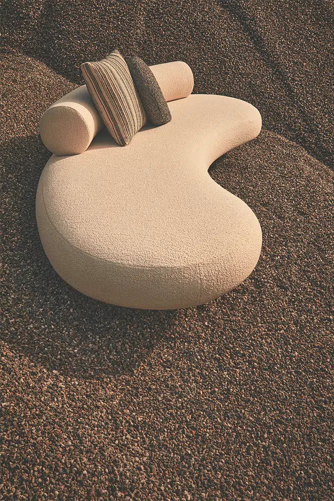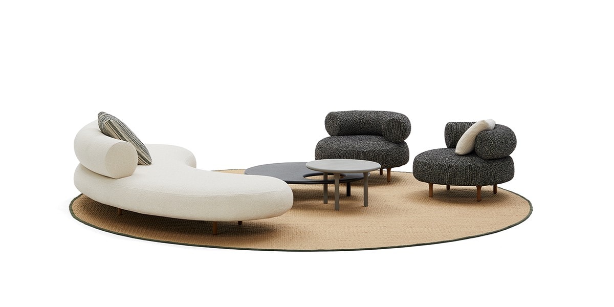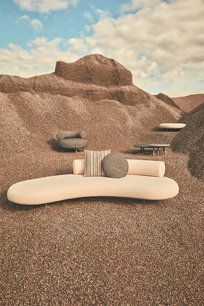All that changes is the setting: Elisa Ossino steps outside the home and takes the virtues of her interior chair and table collection into the open air. The sofa and armchair share the same fluid forms but upholstered in a durable outdoor polypropylene fabric particularly pleasant to the touch, and featuring Iroko feet. The coffee tables, which can be paired to create new iconographies, are in Granito Nero Assoluto and Quarzite Grigia, treated with Olio Idro.