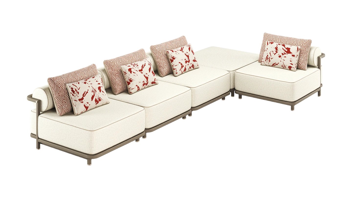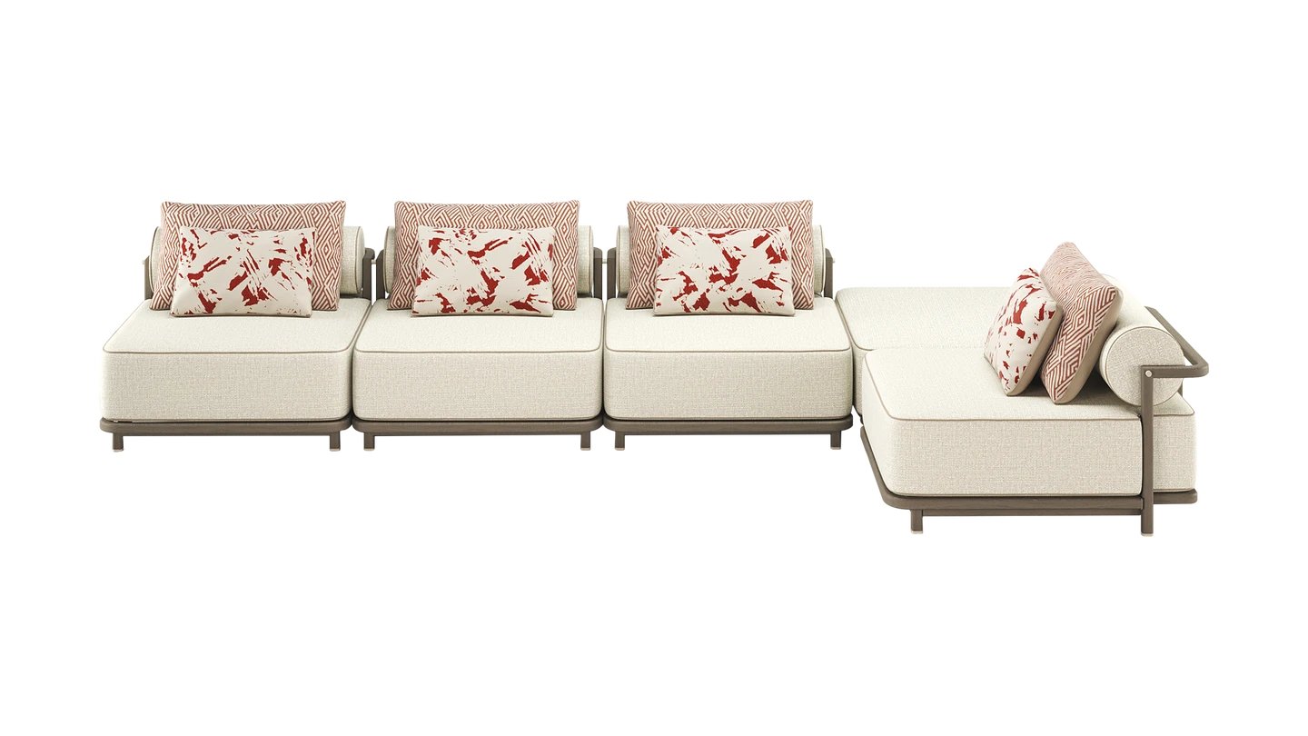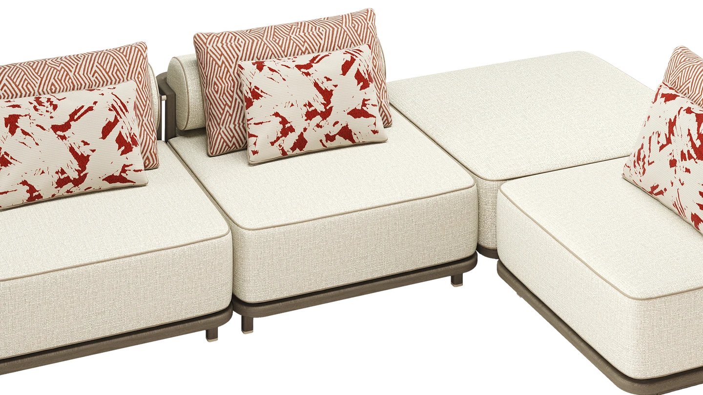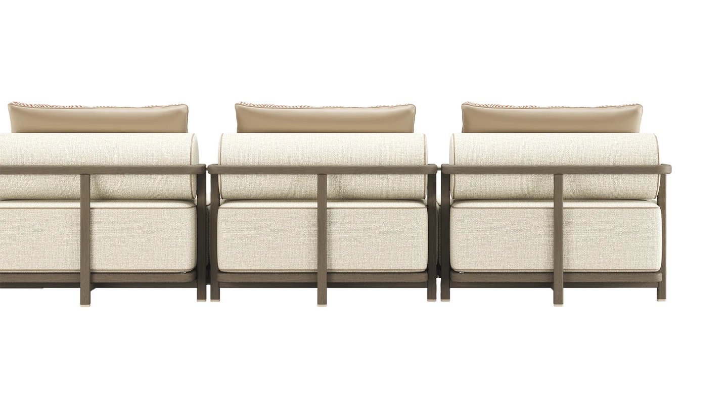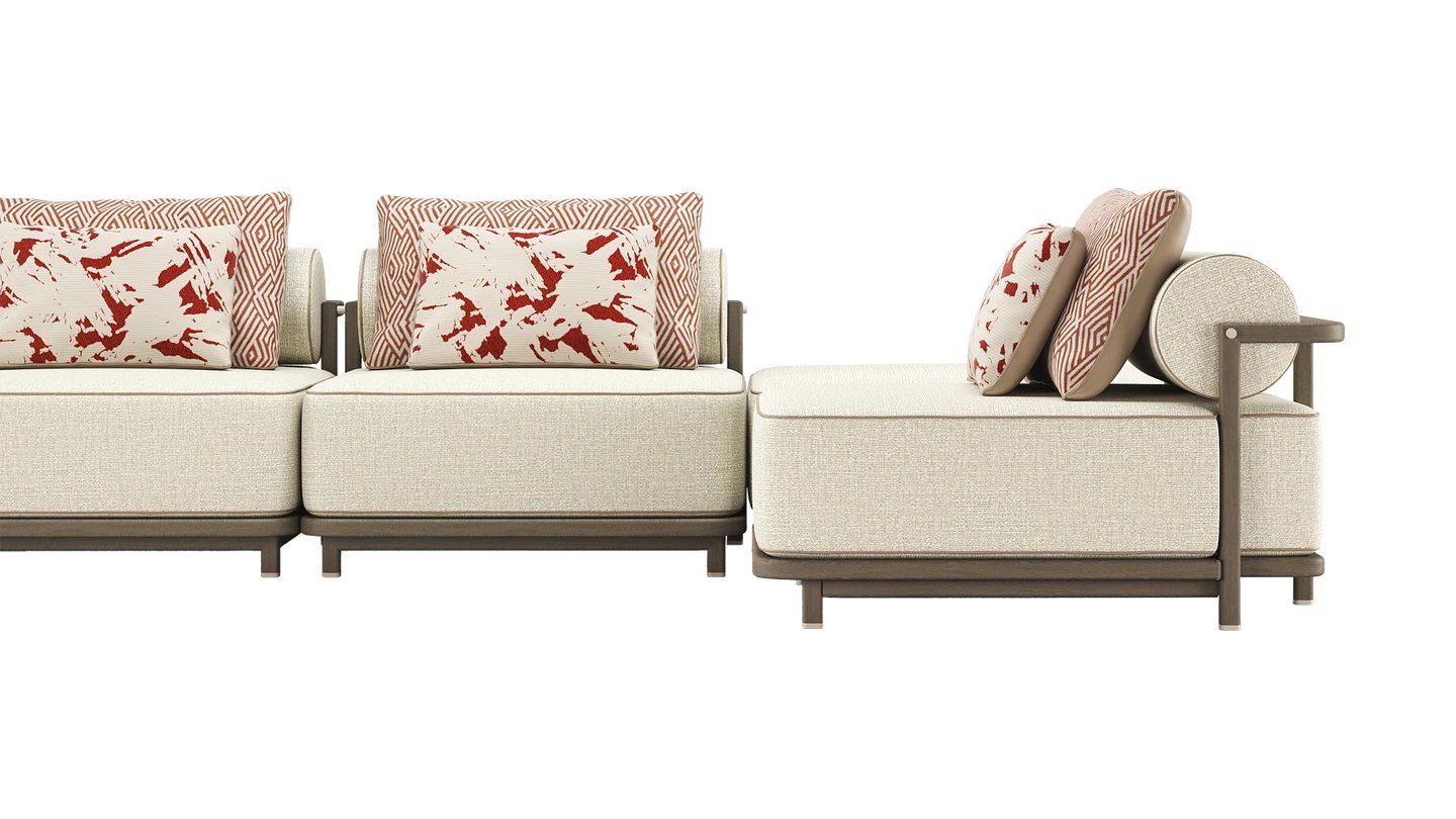"Designed with outdoor entertaining in mind, the SAINT-TROPEZ Sofa has two modules. It’s crafted from a fabric, piped with leather, to soak up the last of the sun’s warmth. "