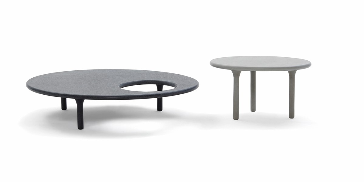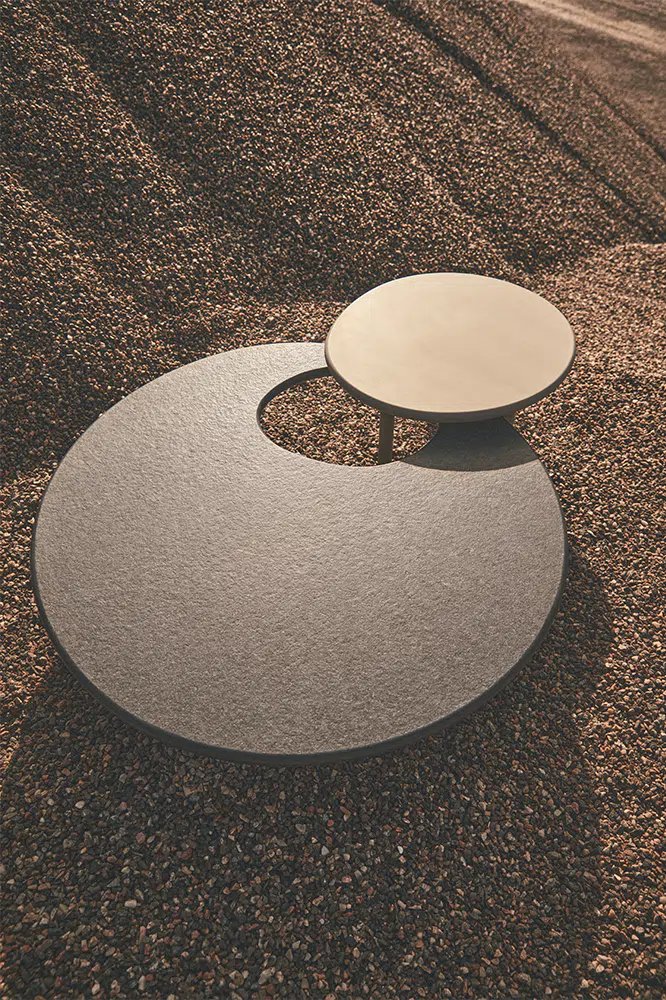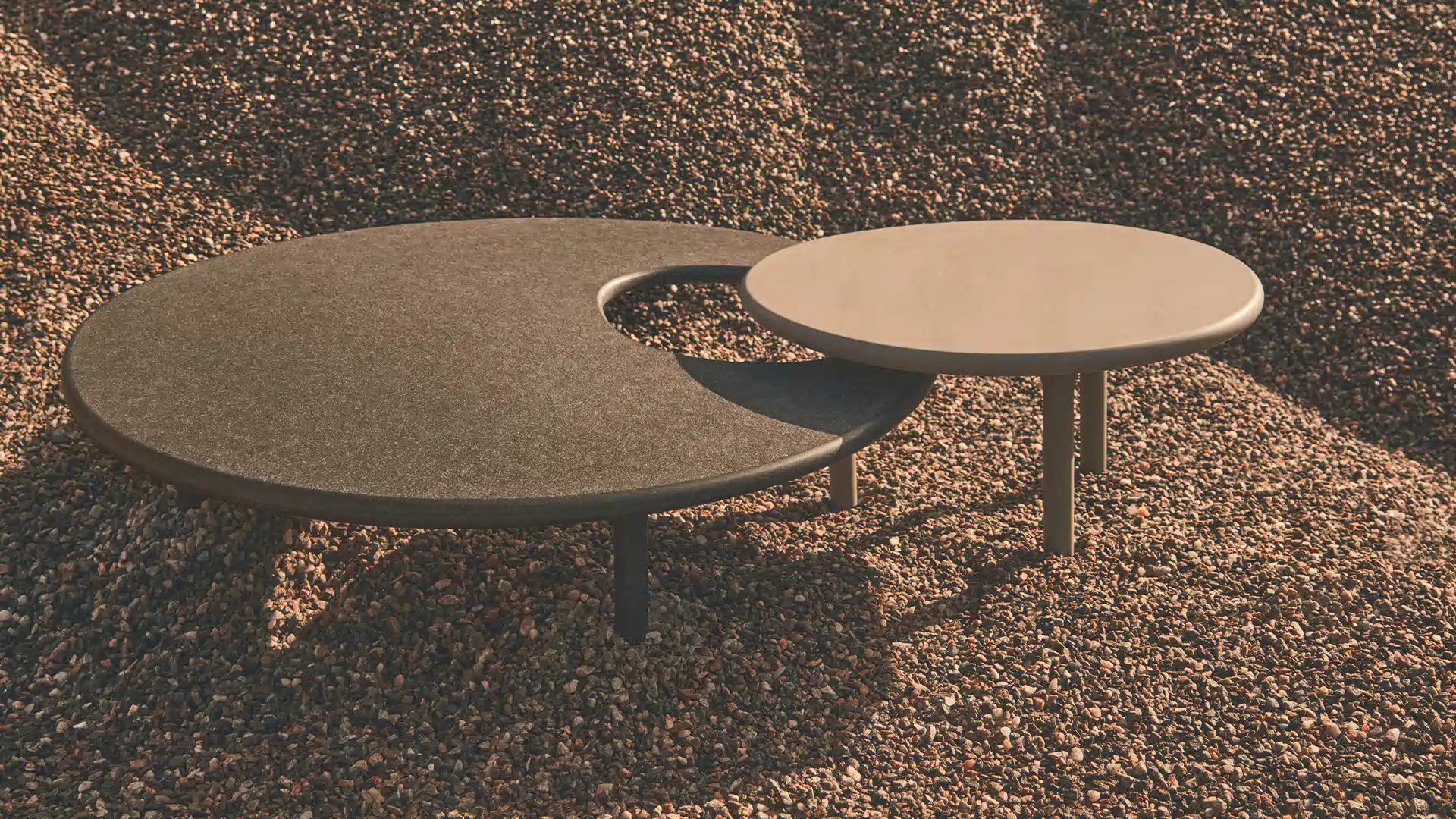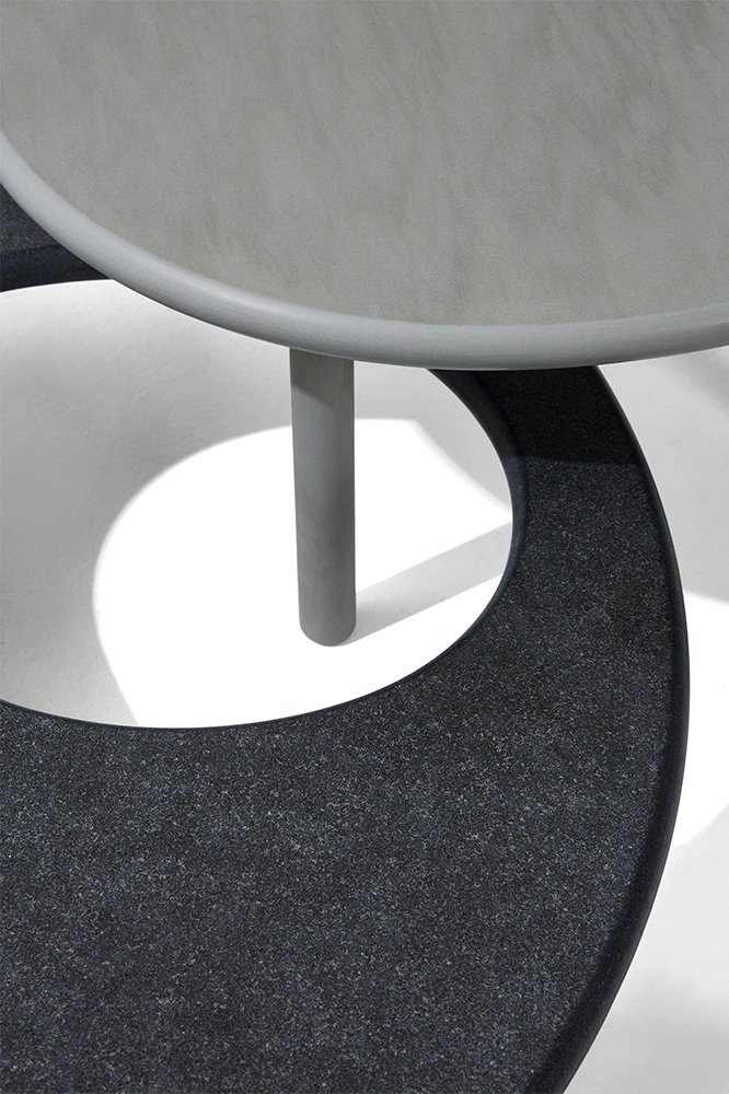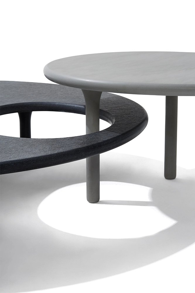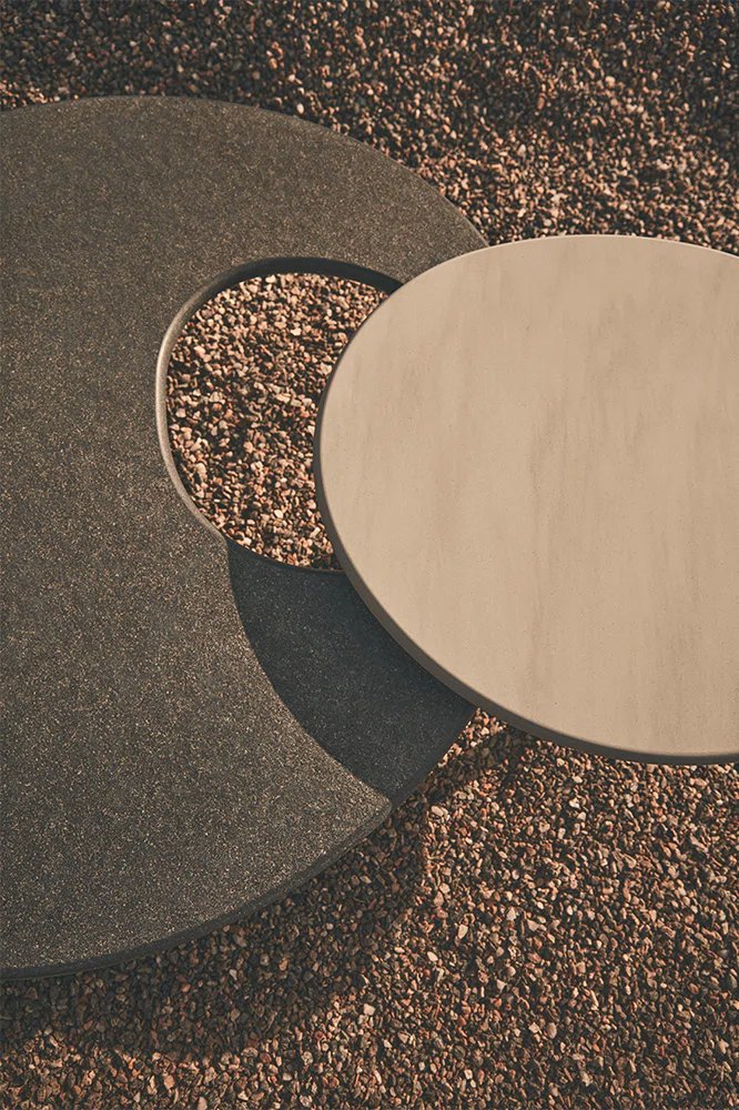 All that changes is the setting: Elisa Ossino steps outside the home and takes the virtues of her interior chair and table collection into the open air. The sofa and armchair share the same fluid forms but upholstered in a durable outdoor polypropylene fabric particularly pleasant to the touch, and featuring Iroko feet. The coffee tables, which can be paired to create new iconographies, are in Granito Nero Assoluto and Quarzite Grigia, treated with Olio Idro.