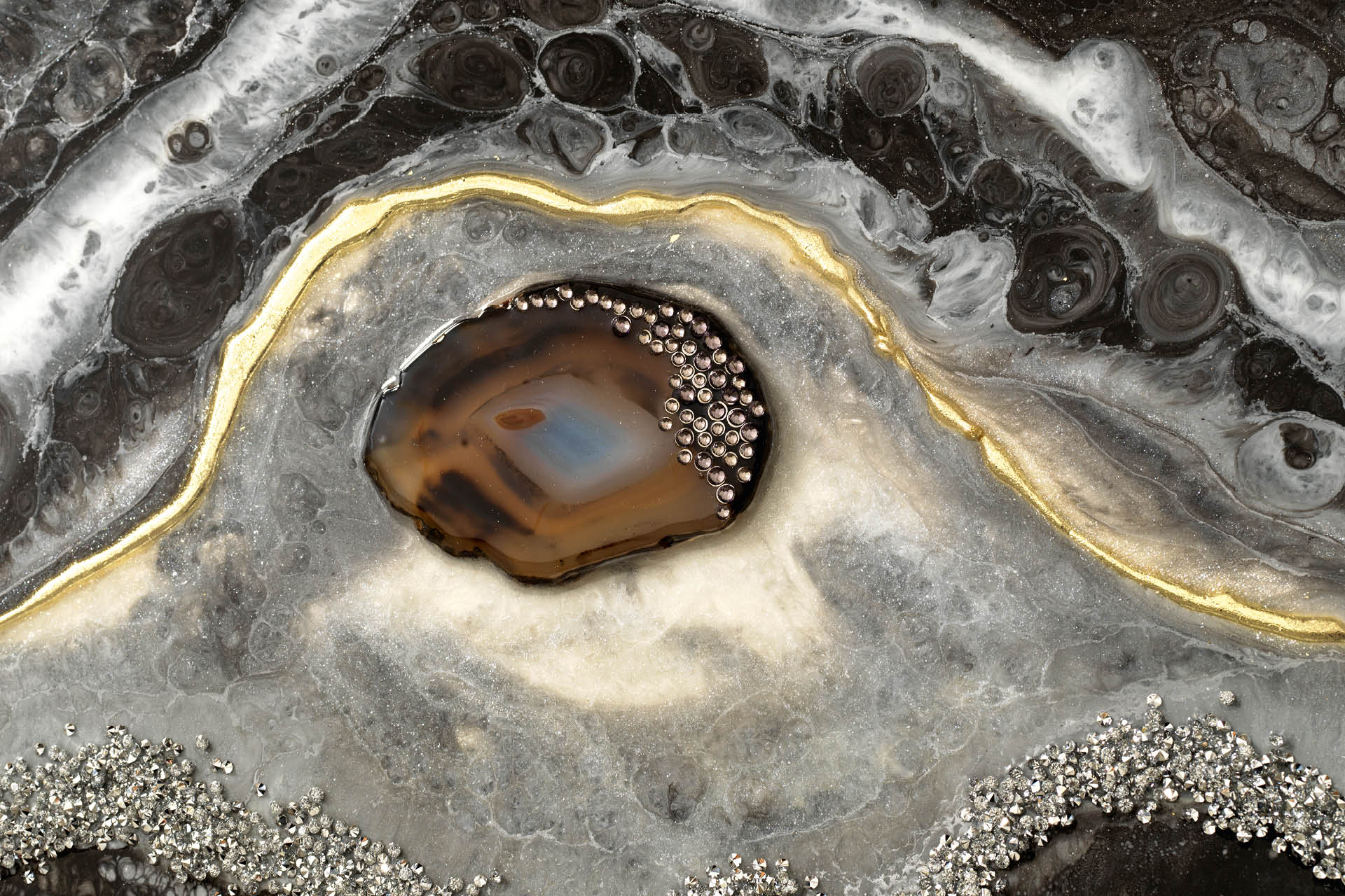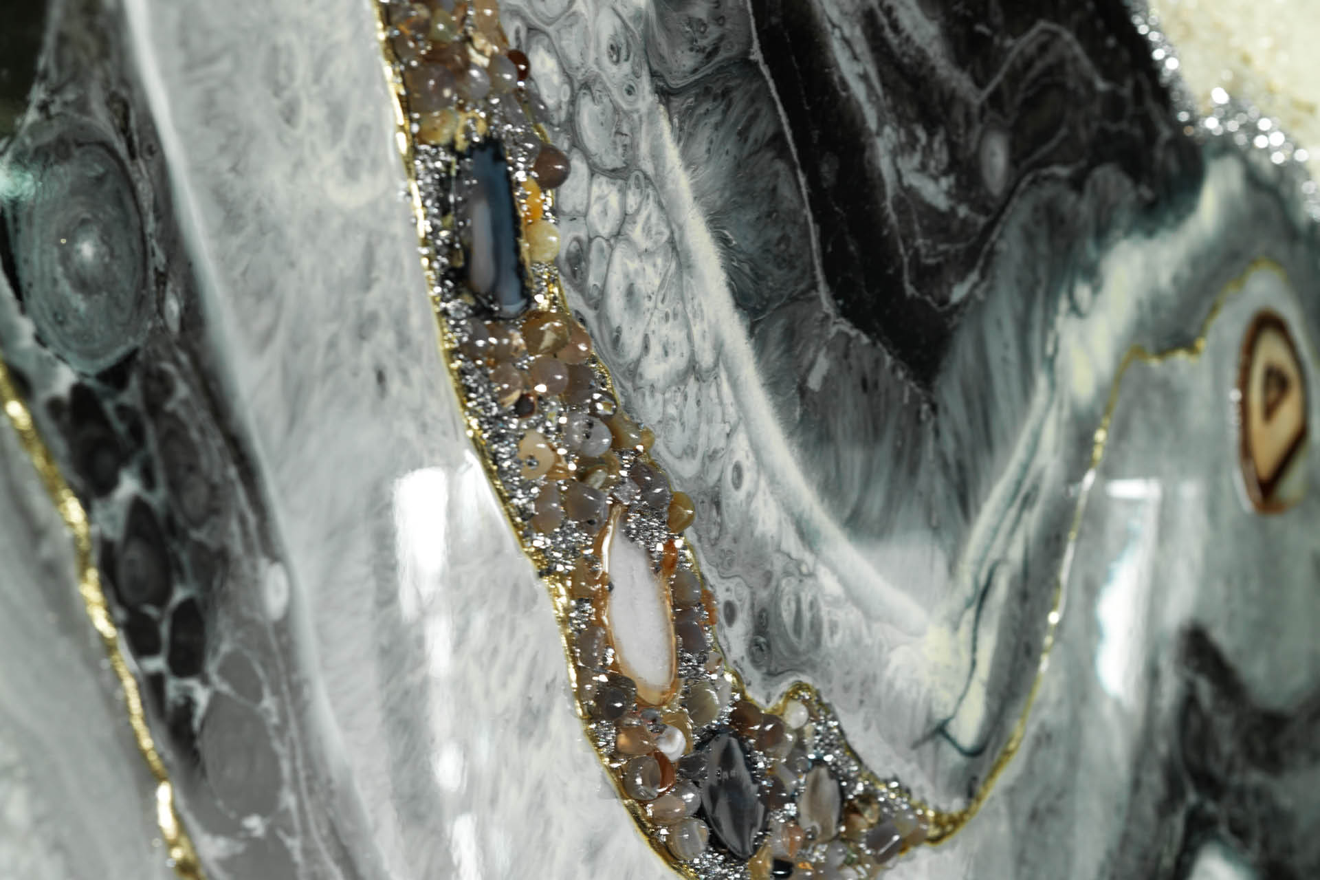 Rectangular painting in wooden structure with stainless steel frame. Epoxy resin with UV protection base in combination of "Swarovski” crystals, agate stones and gold leaves.