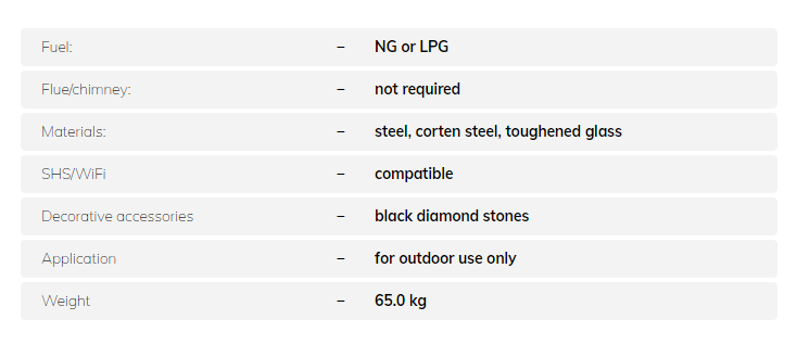 Galio Corten Fire Pit is a free-standing, portable product. It allows for easy installation and free arrangement of the fireplace – no electric connection required. Two control solutions, an integrated Easy Start panel and convenient handheld remote, offer extra comfort and easy control of the device and flame. Optionally, you can equip the fireplace with a wifi or smart home system module and conveniently control the fire using a mobile application. Together with low operating voltage and two fuel options (Natural Gas or LPG), it is the ideal fire pit table for outdoor spaces of any kind.