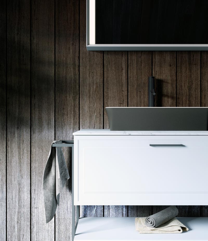 In a warm and welcoming atmosphere, the presence of wood highlights the neoclassical purity of white. The external washbasin surface , combined with the Structura element, harmonizes with the veins of Carrara marble.