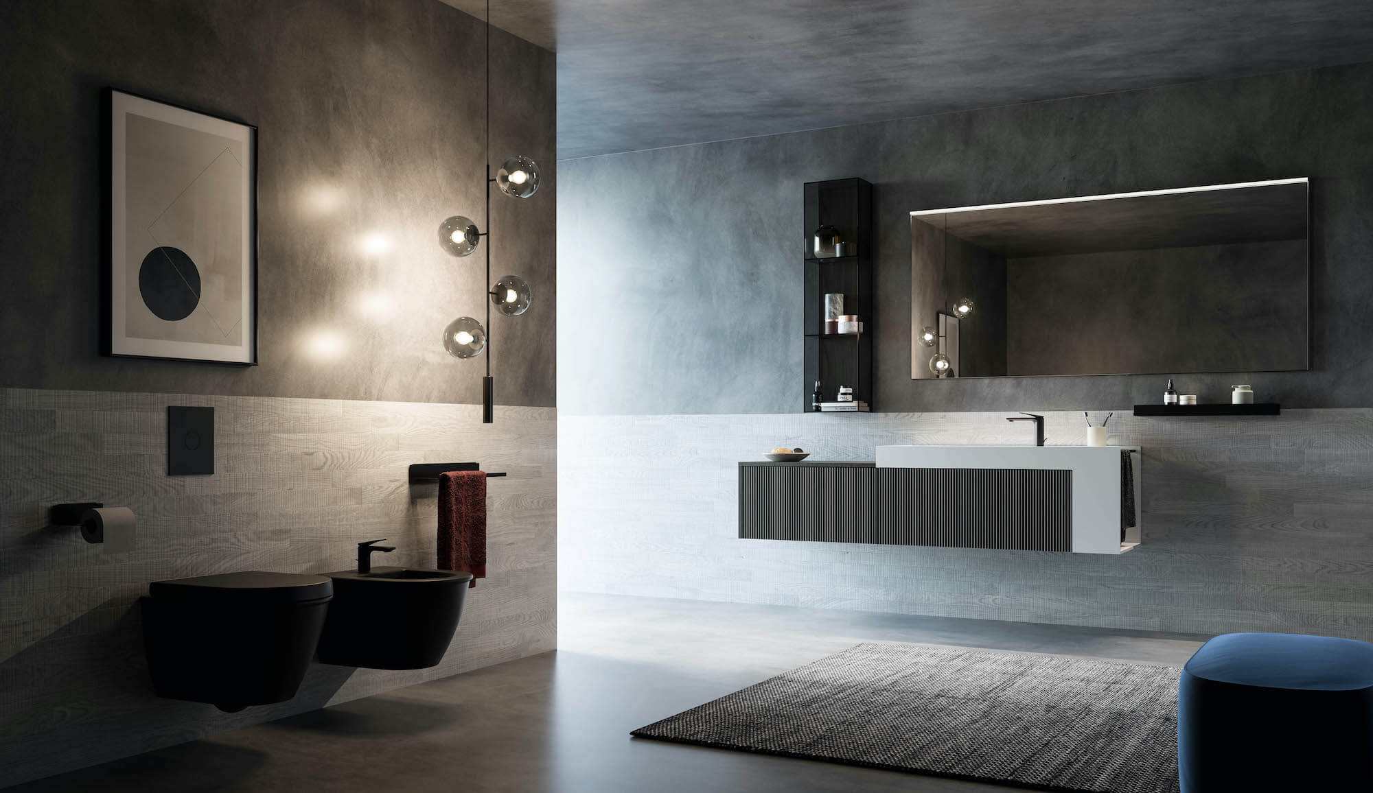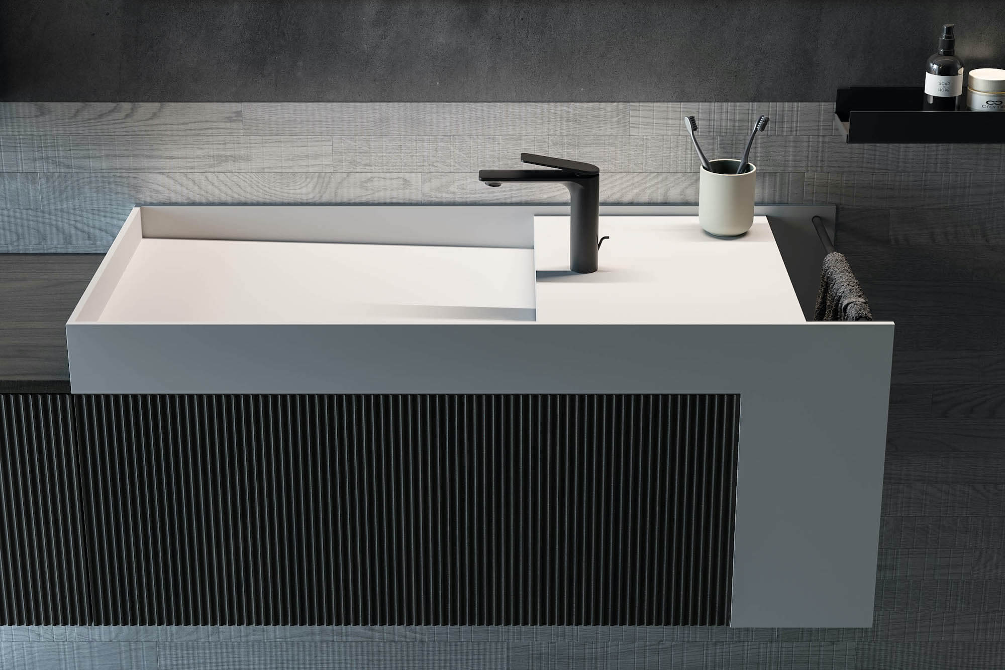 The Vertigo cabinet looks like an element embedded in the WRAP solid surface washbasin. An exclusive PUNTOTRE washbasin with essential lines that catches the eye with its purity, remaining practical and usable in its exclusivity. The WRAP washbasin also conceals an exclusive towel rail function.