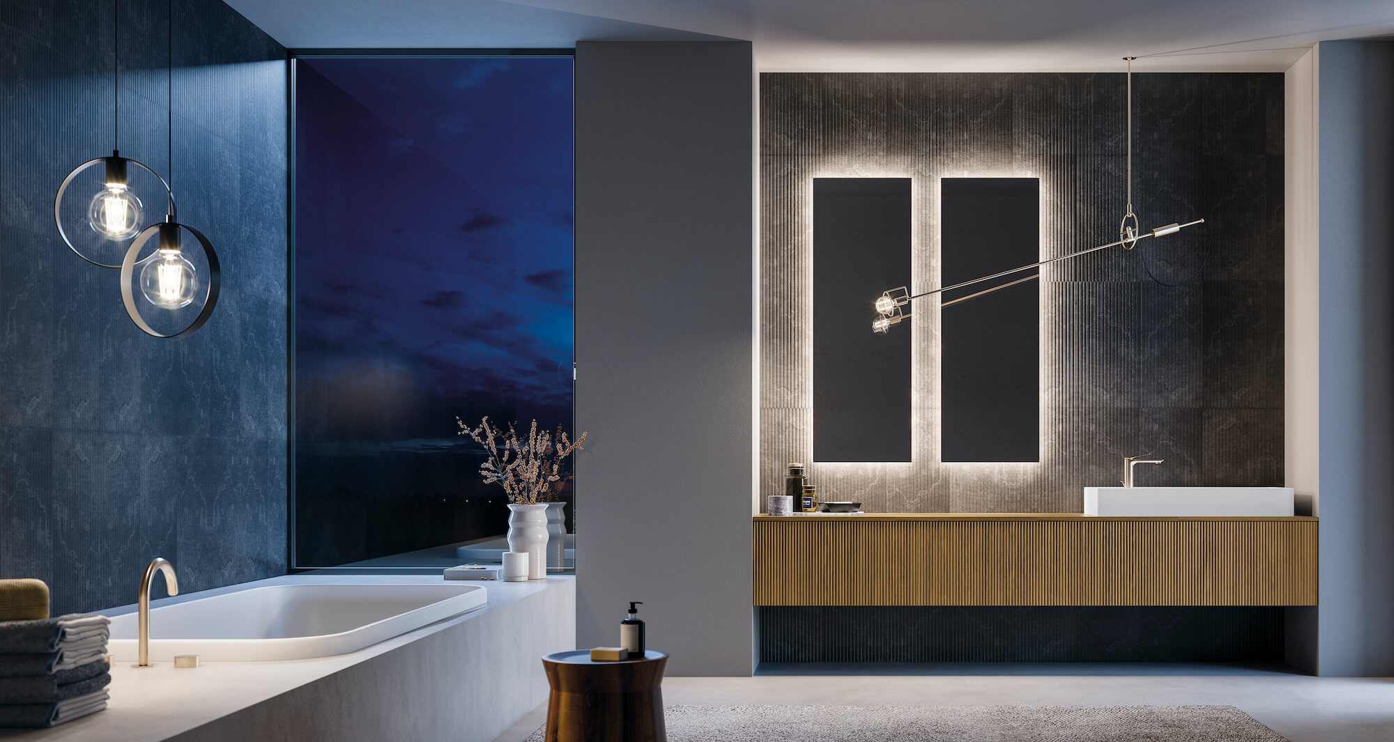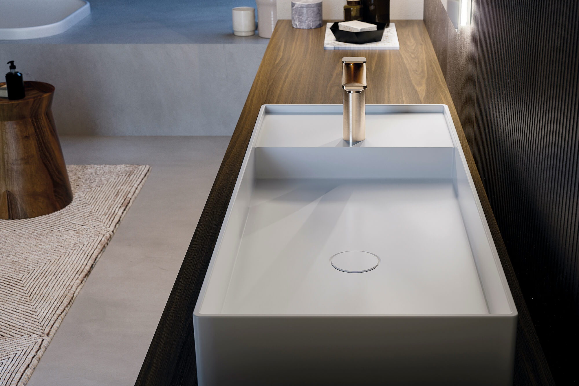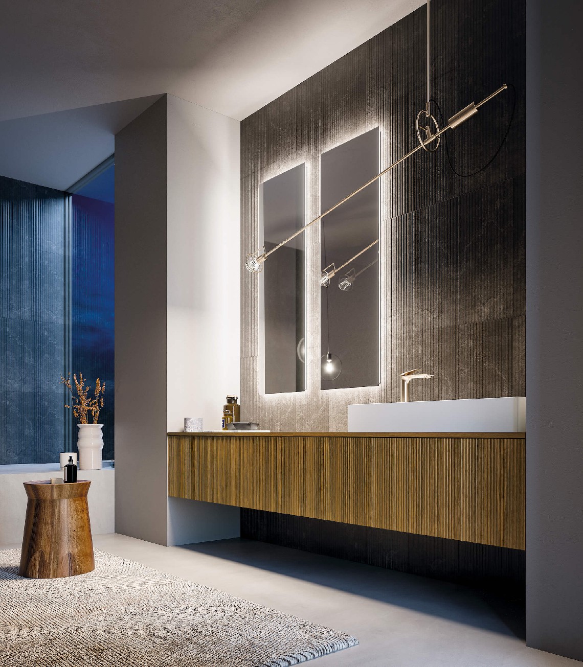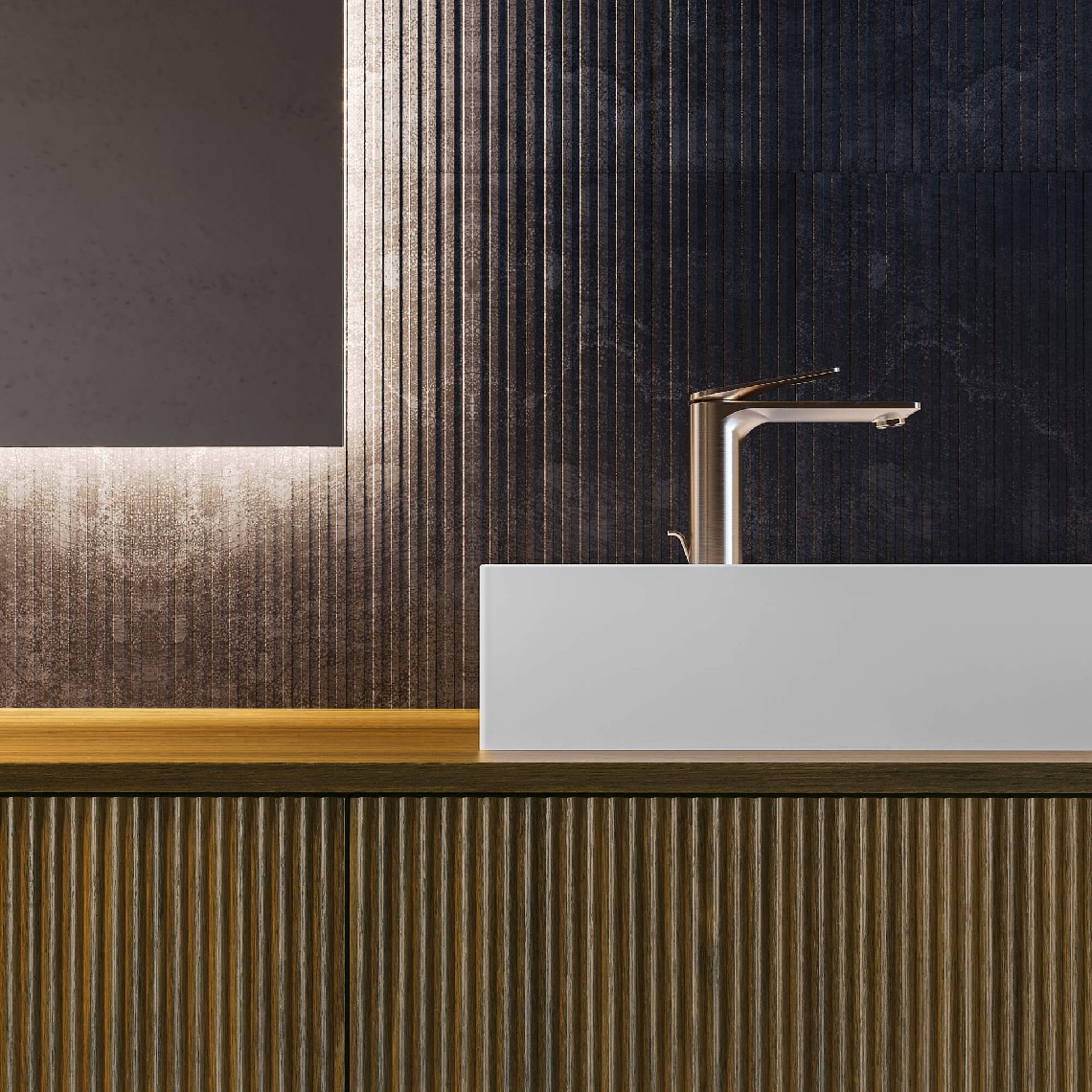Extremely clean volumes, for a piece of furniture that speaks for itself, expressing all its bursting elegance. A pushed perspective, to highlight the shapes of the washbasin resting on the polymeric top. It seems a work of art this game of rigorous and geometric volumes. In these close-up details, the exclusive “cannettate” workmanship of VERTIGO is highlighted.