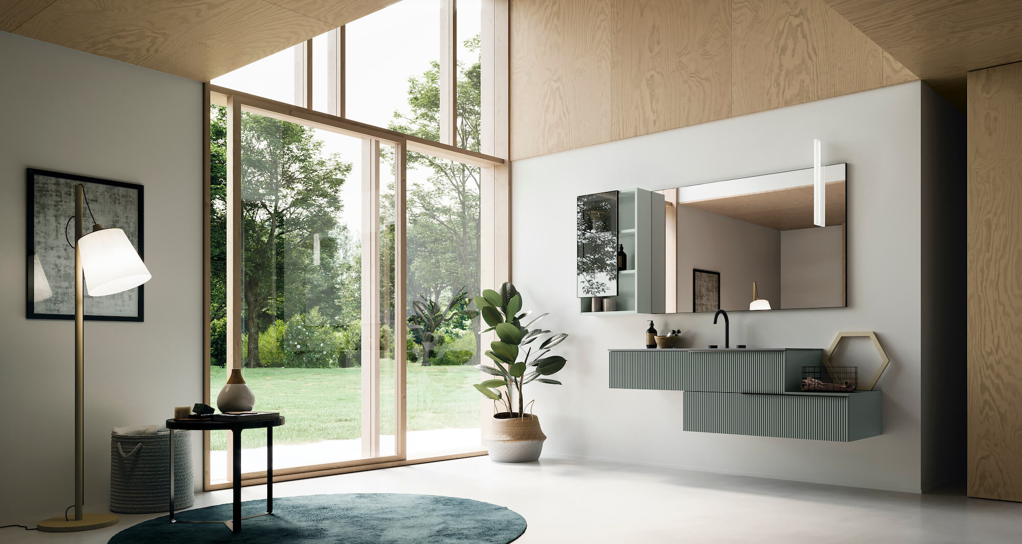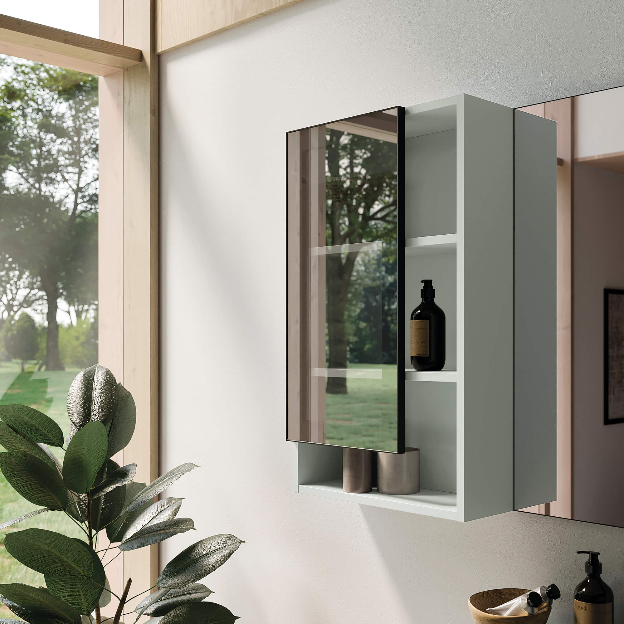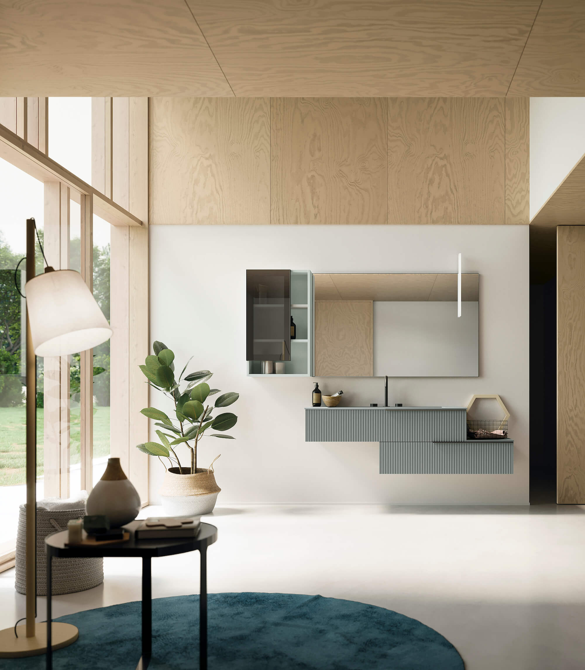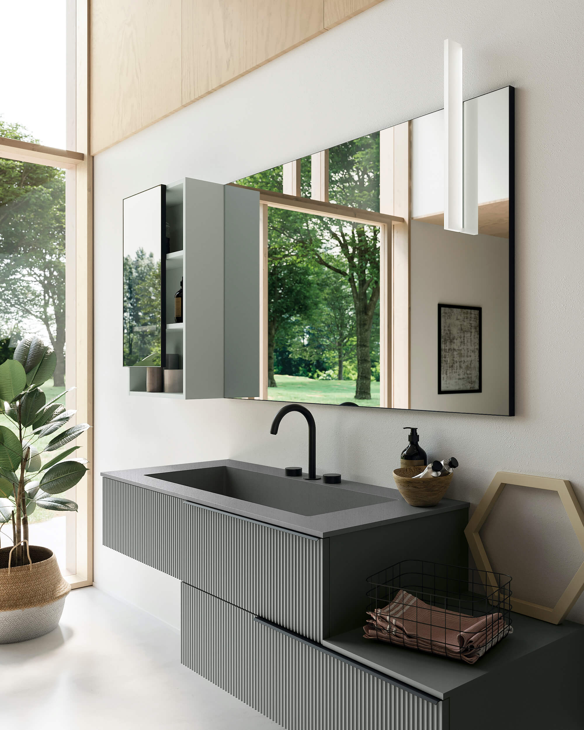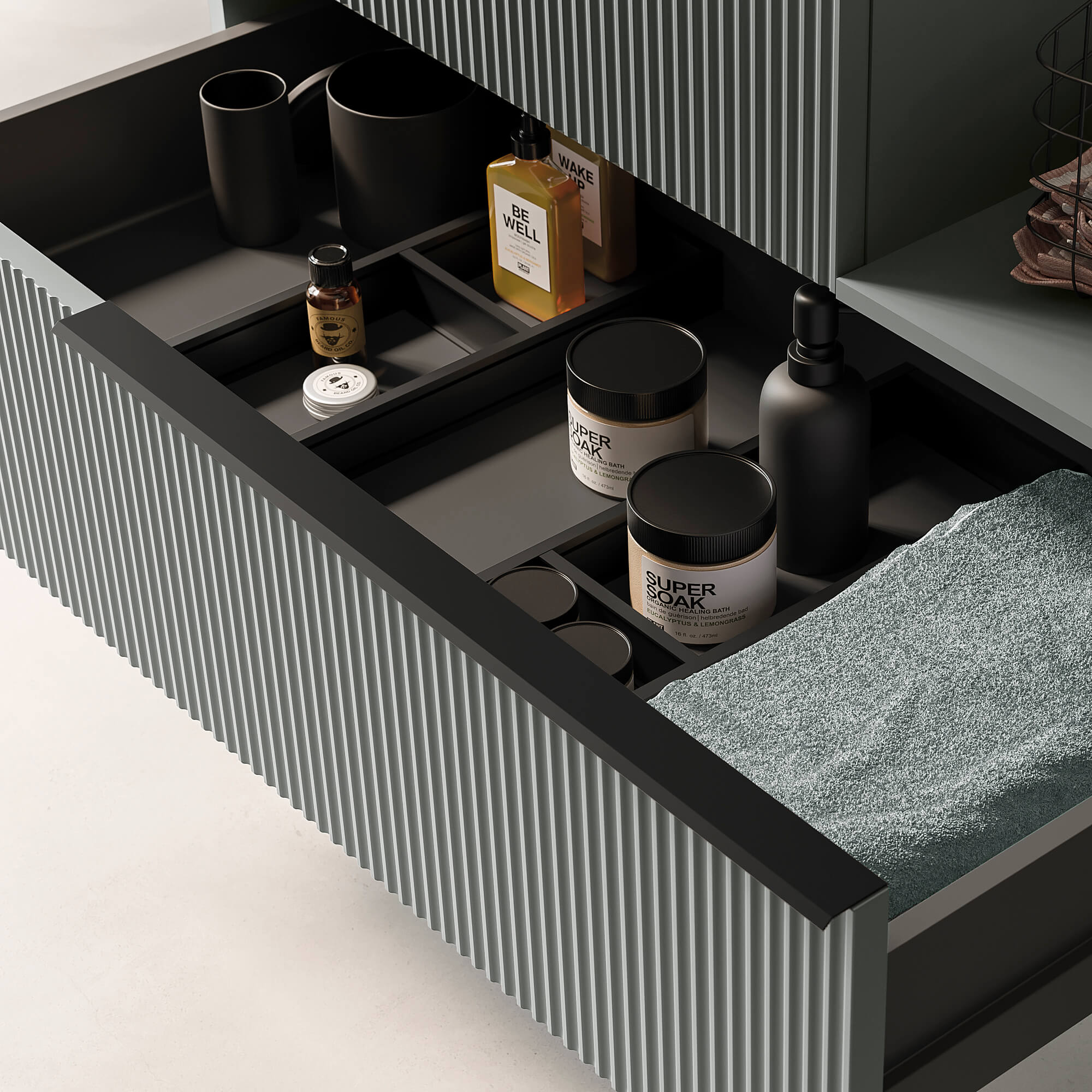 In an environment suitable to highlight the geometries of the VERTIGO fronts, the Powder Grey lacquer of this composition elegantly matches the Cement shades of the Deimos top. An intriguing perspective that highlights the play of volumes of the VERTIGO elements. The drawers can be equipped with different elements with flexible compartments, to organize their interior in the most appropriate way.
