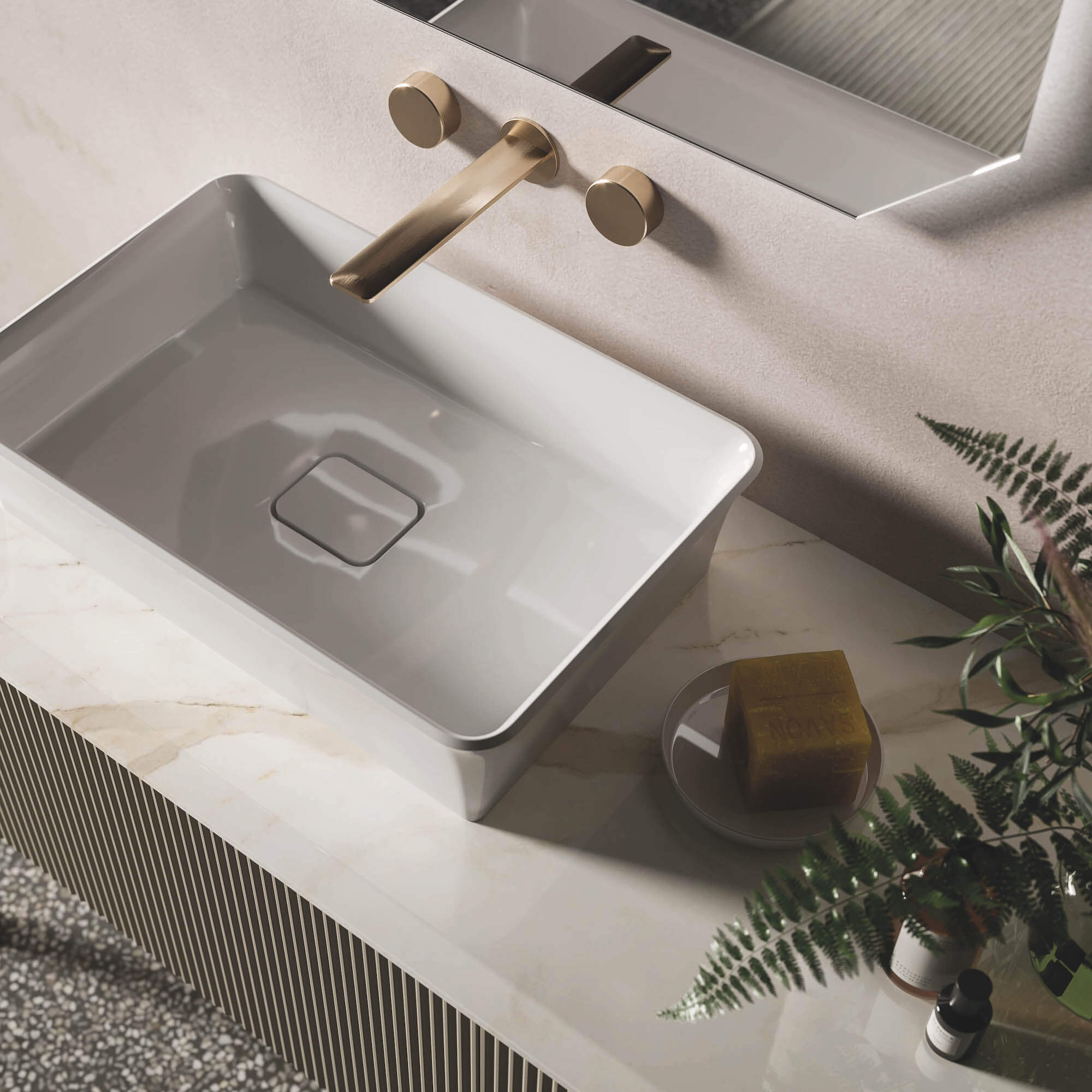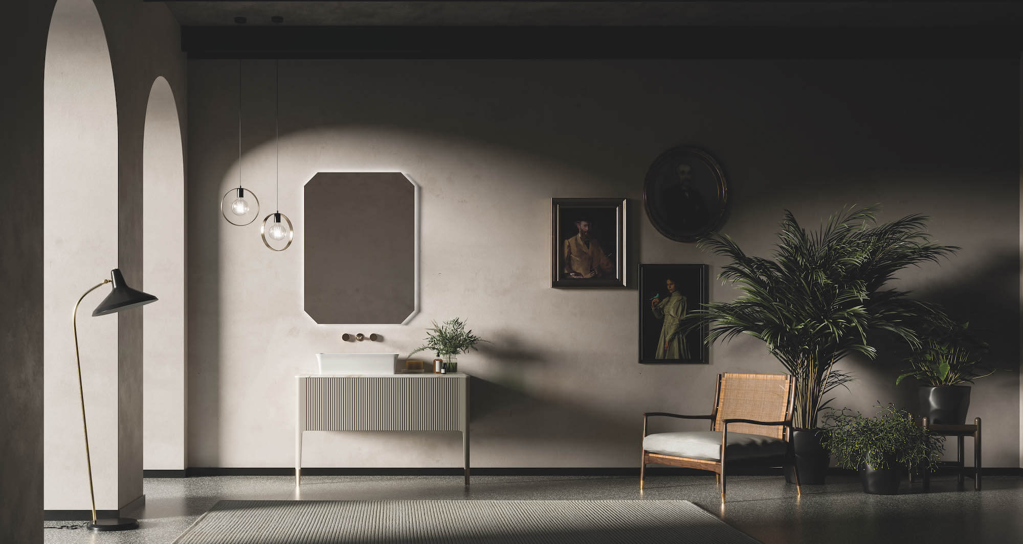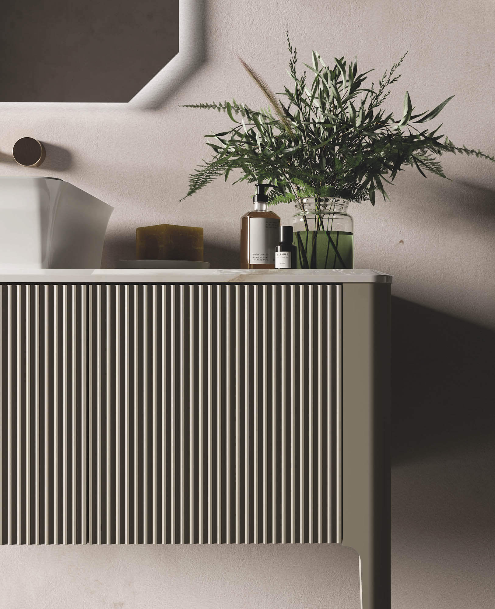 The grazing light highlights the interplay of the three-dimensional volumes of the VERTIGO fronts, while the OTTAGONO BIG mirror helps to reinforce the mix of modern and classic in this ART-inspired solution. Note the elegance of natural stone with optional bevelled profile, a touch of exclusivity in a fascinating piece of furniture.