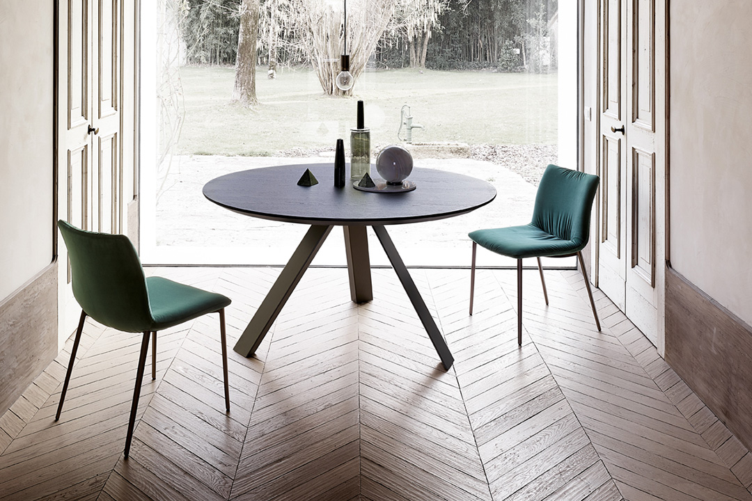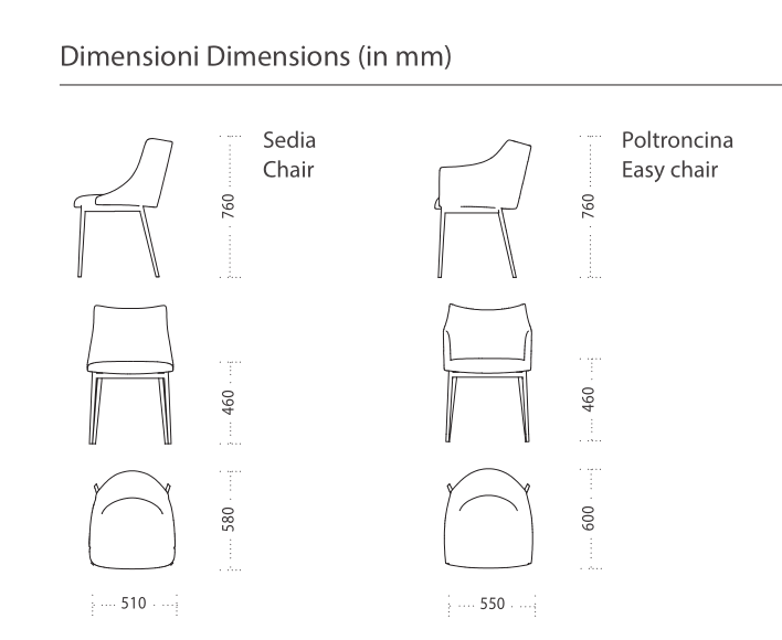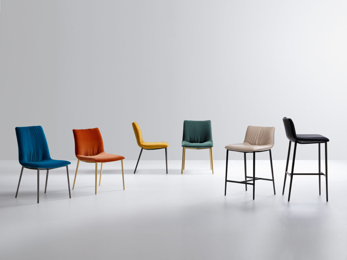 Collection of chairs, easy chairs and stool with painted metal structure and soft seat available in leather, synthetic leather or velvet.