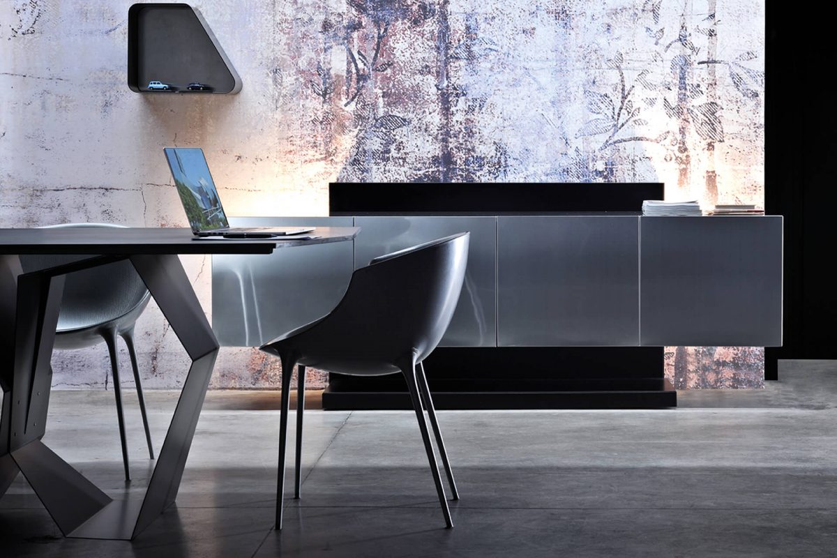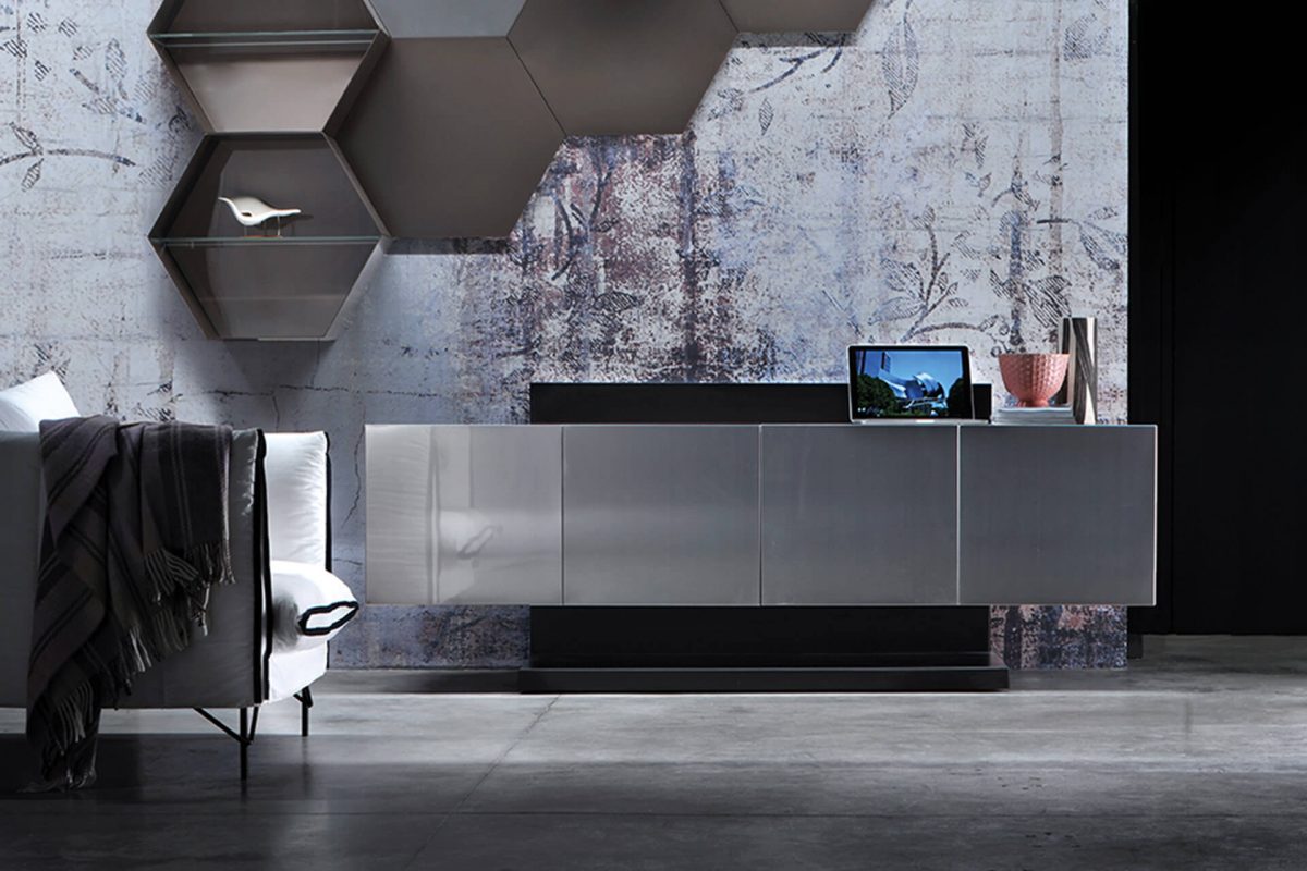 Freestanding sideboard with a metal cabinet (no-fingerprint steel or burnished finishes) and a matt laquered structure.