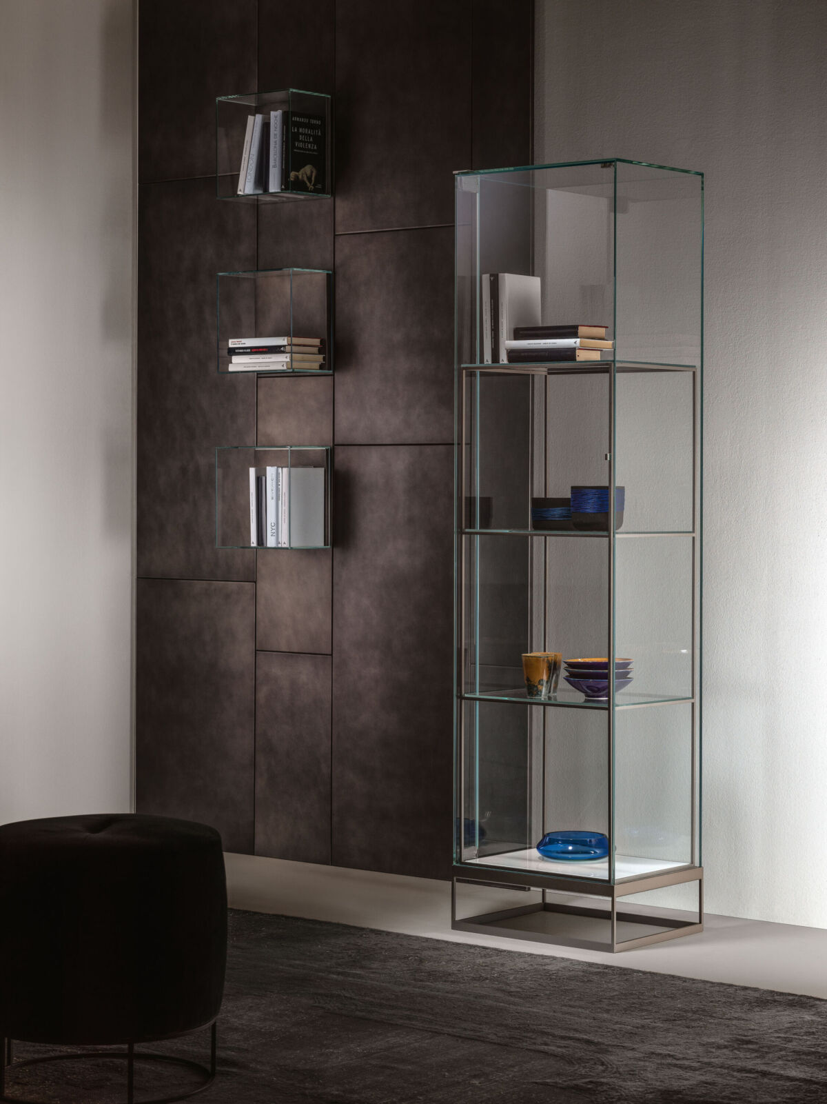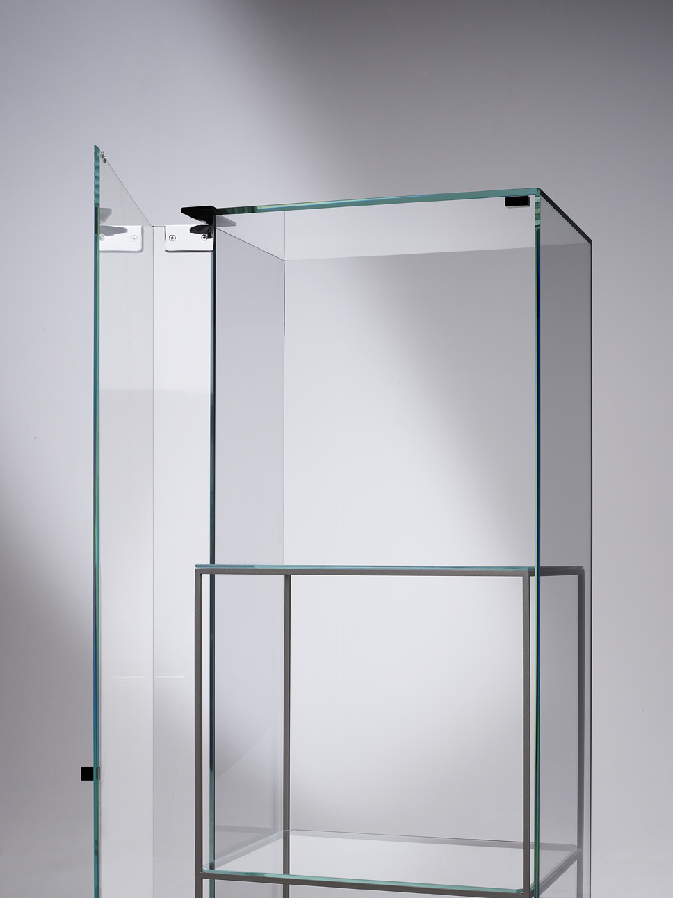 Prima è una vetrina in cristallo extrachiaro, con una struttura interna in metallo a sezione quadrata e un’anta a cerniera laterale.