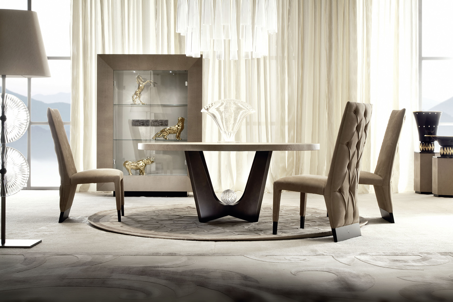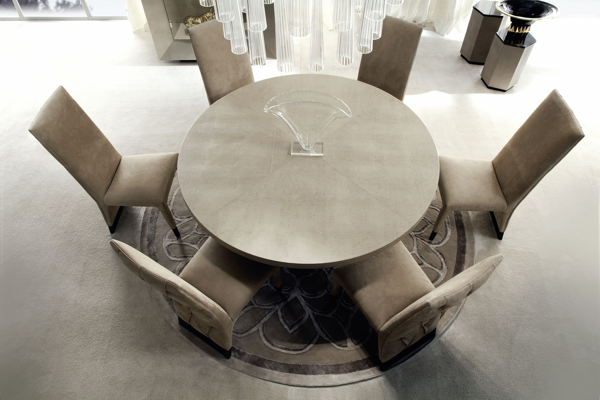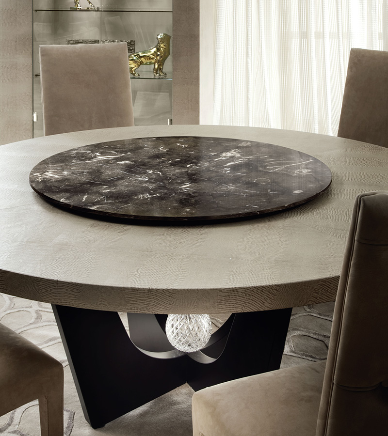 Round table in armadillo printed leather. Details in bronzed brass and base with insert "Murano" crystal ball.