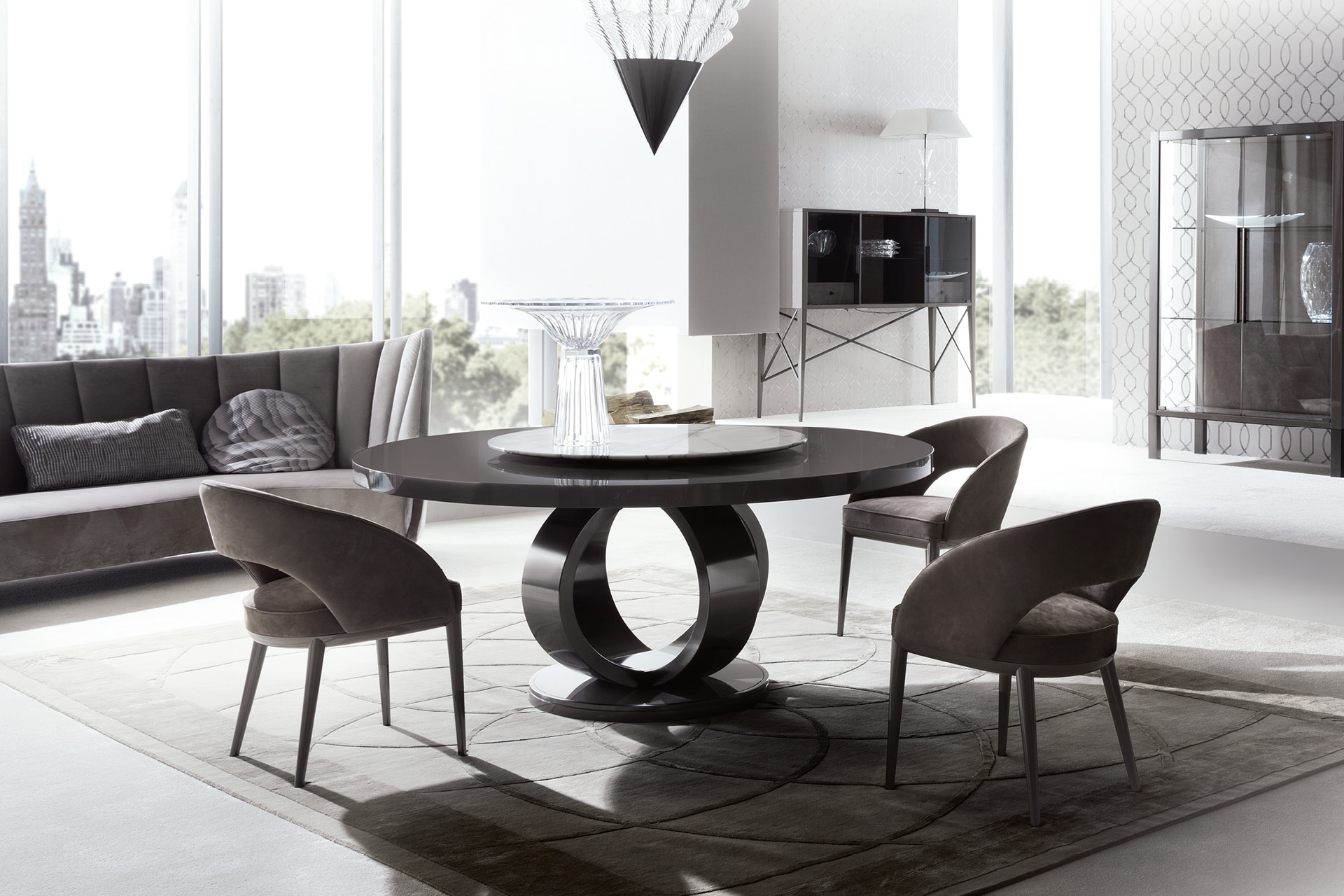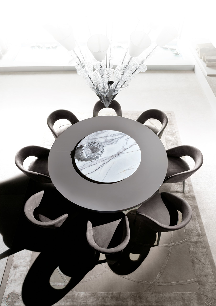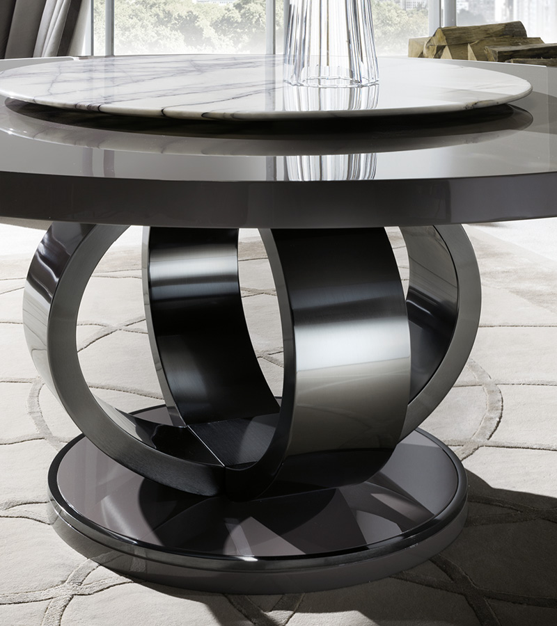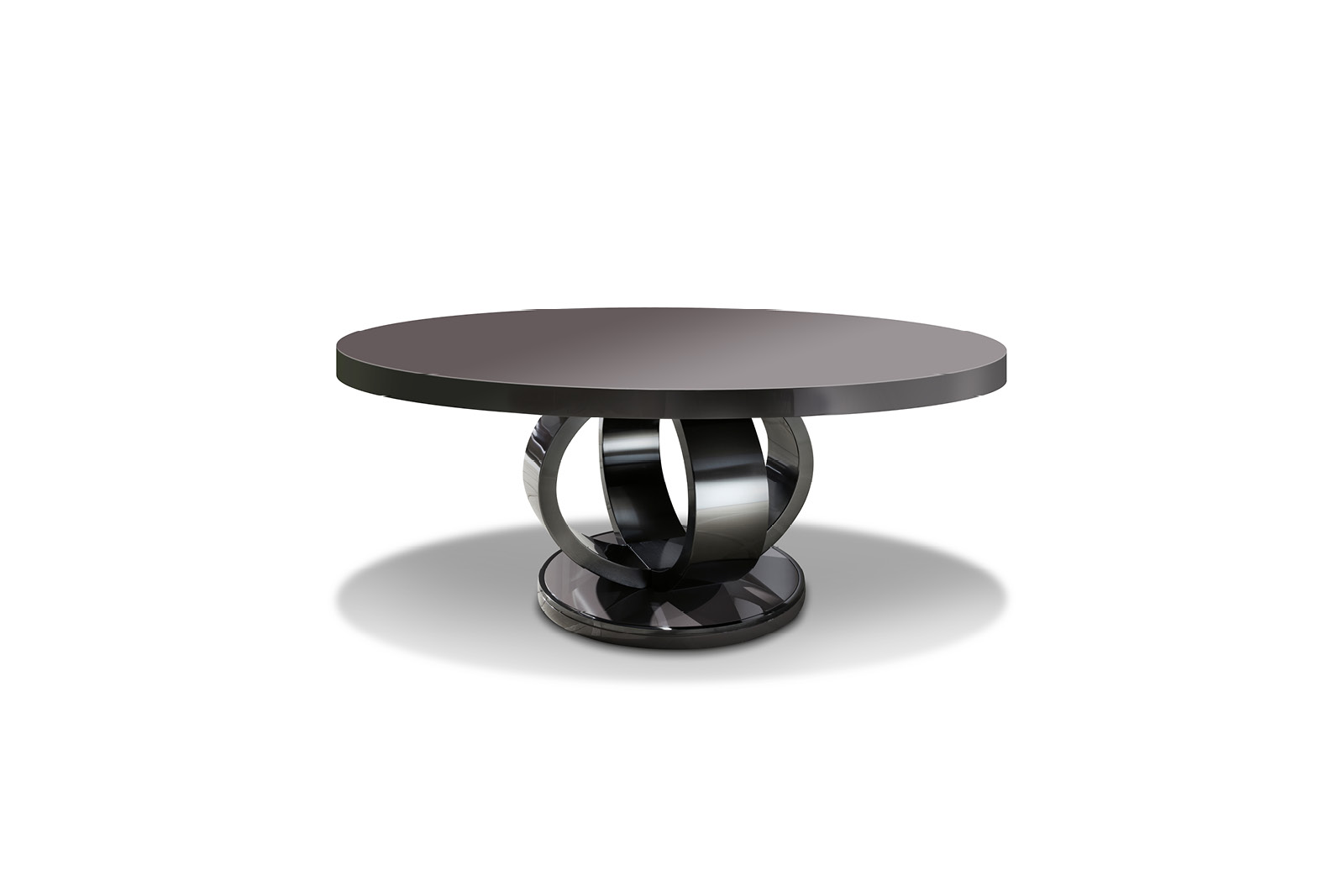 Round table in high gloss polyester grey lacquer. Fixed top with base in black nickel steel.