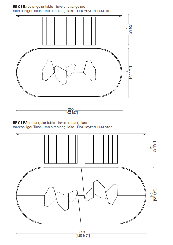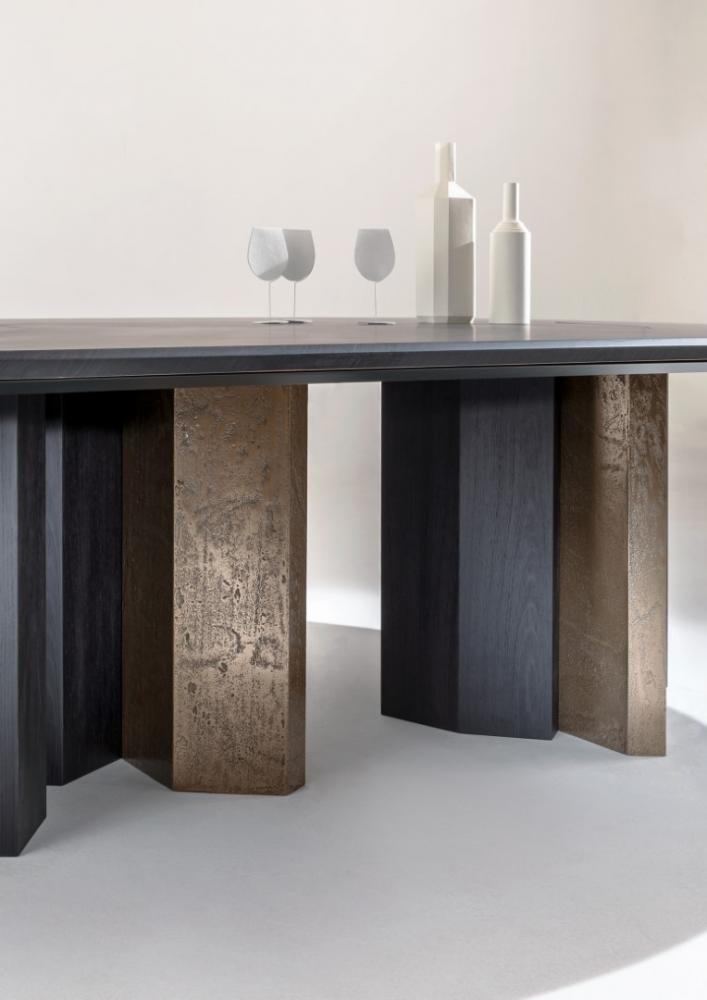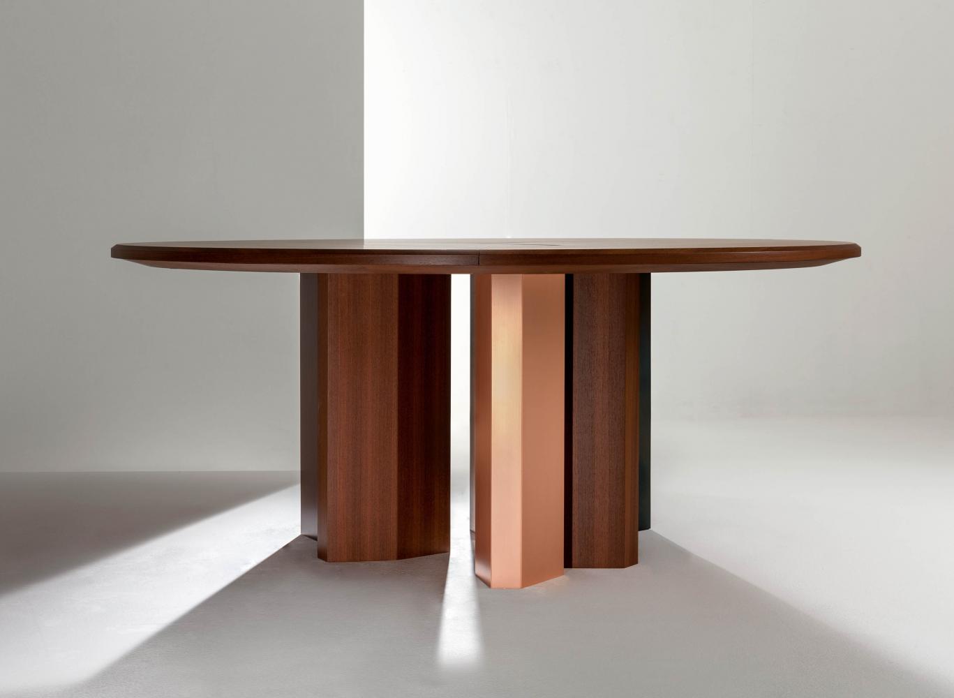 Family of tables in marble or wood, featuring important and at the same time essential shapes. Legs and top available in all the woods of the collection, natural or dyed, with "Raptor" Liquid Metal finish and in marble.
