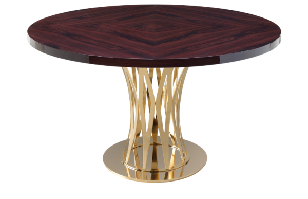 Tavolo alto con base in acciaio effetto satinato opaco, piano in essenza palissandro opaco o tabacco opaco.
