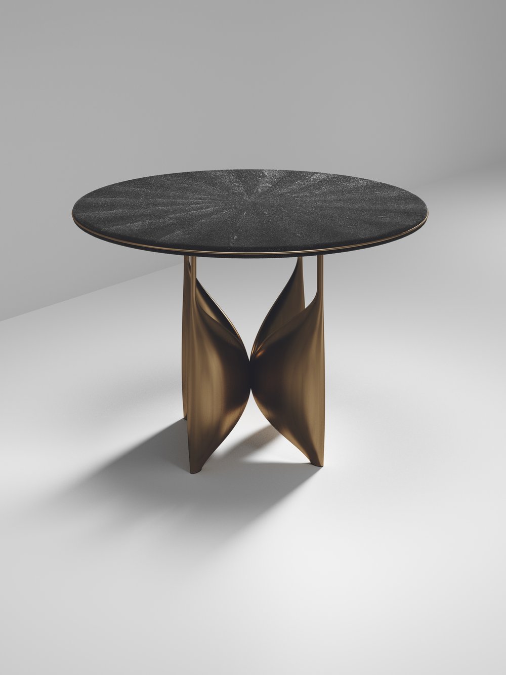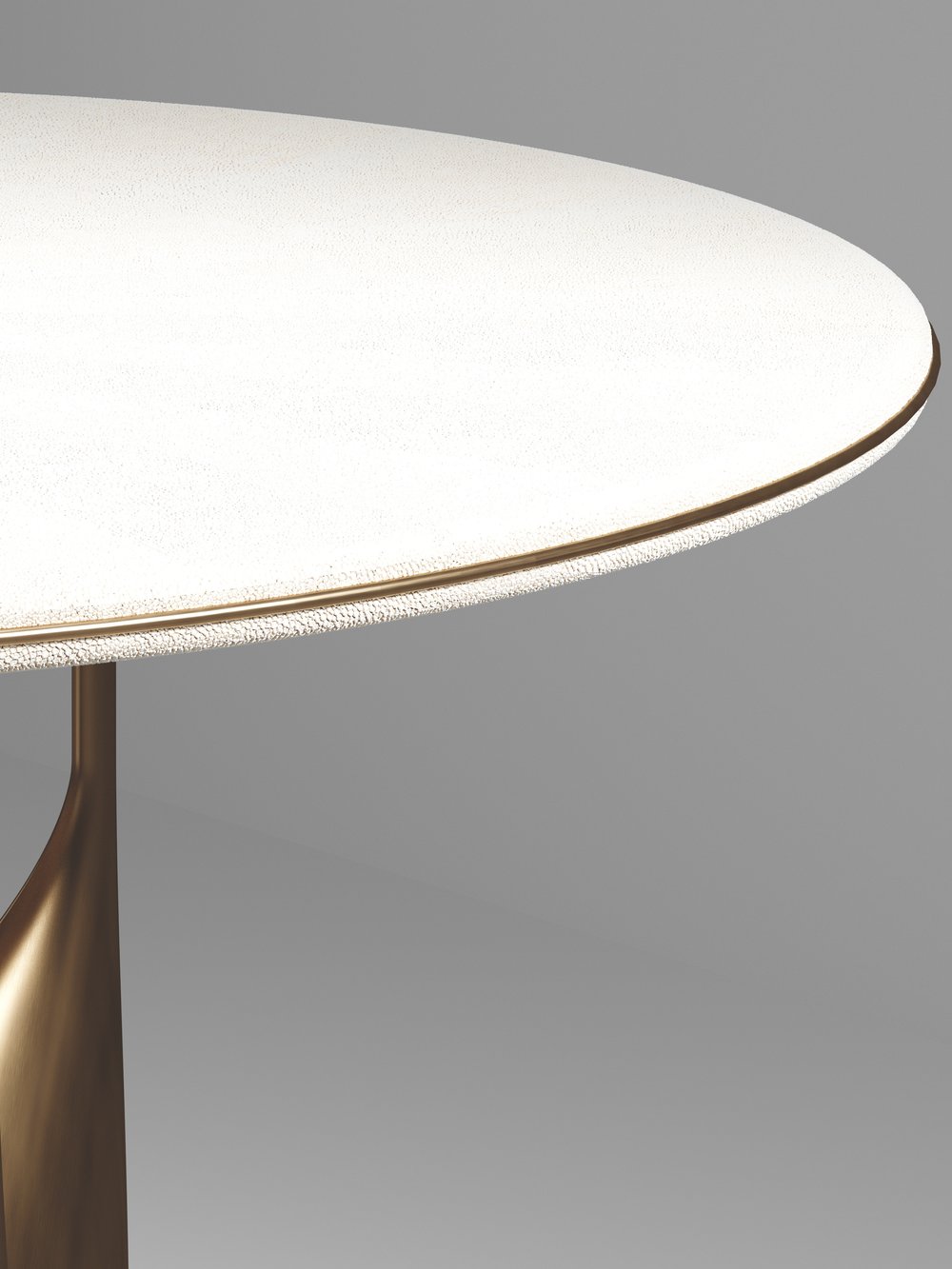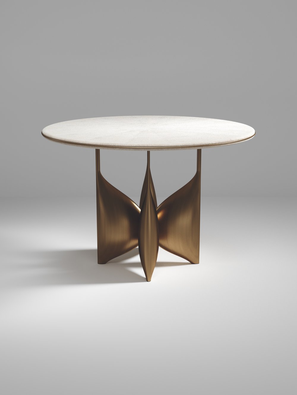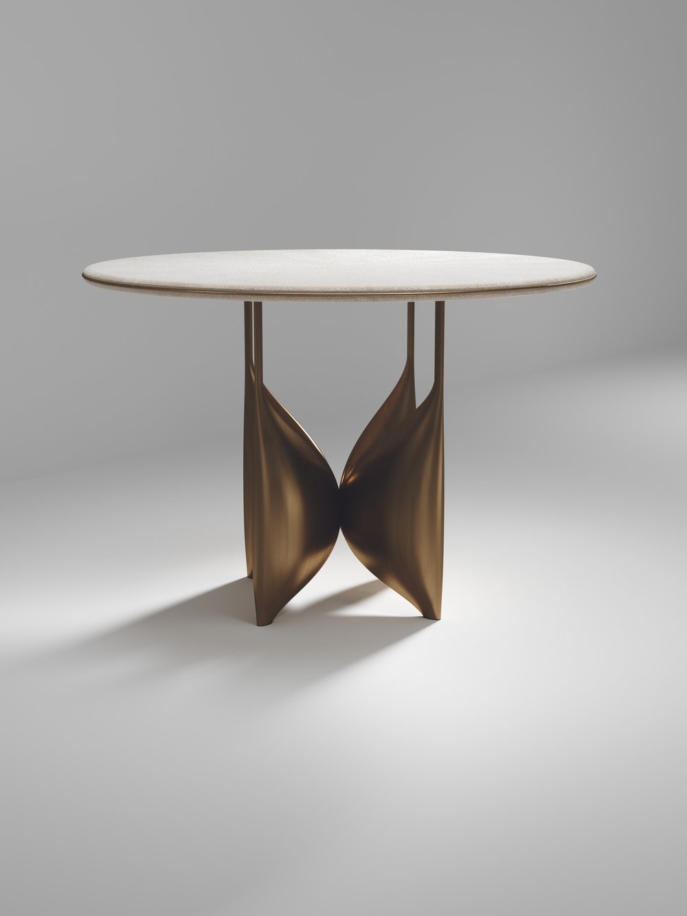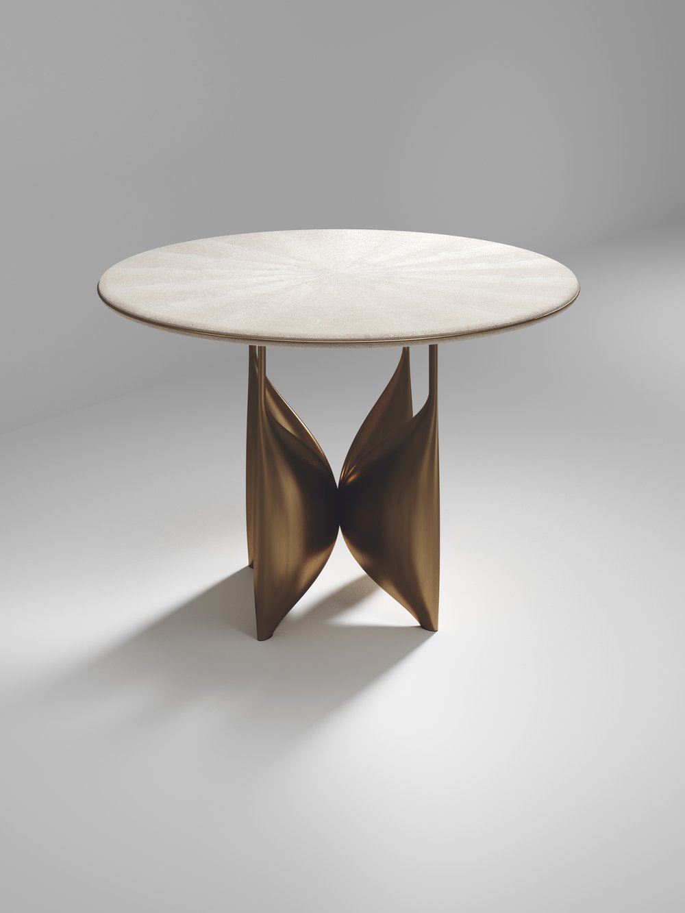The Plumeria breakast table by Kifu Paris is a dramatic and elegant piece. The cream shagreen inlaid top sits on a sculptural bronze-patina brass base that is conceptually inspired by bird feathers floating on top of a lake. The border of the top is accentuated by a subtle and elegant bronze-patina brass indentation detail. This piece is designed by Kifu Augousti the daughter of Ria and Yiouri Augousti. Available in other finishes. Part of the Plumeria Capsule.
