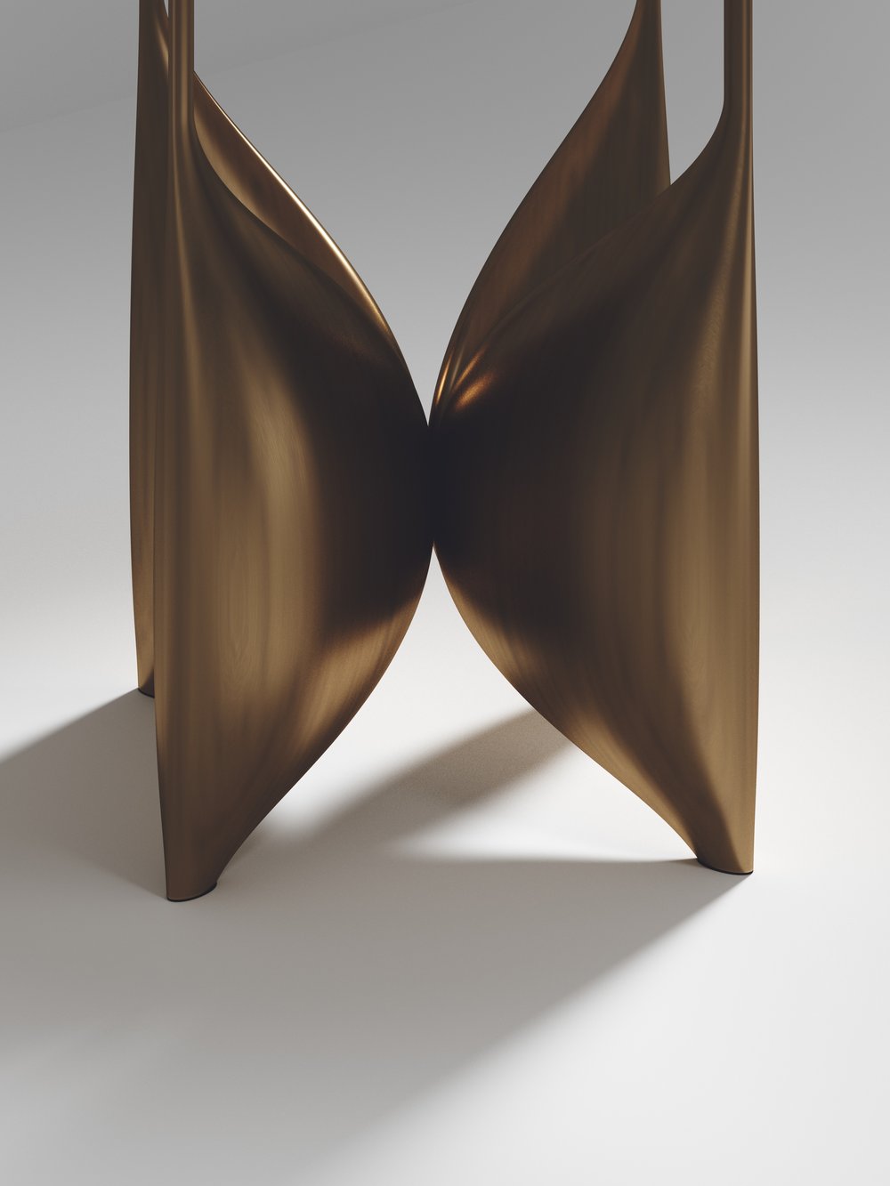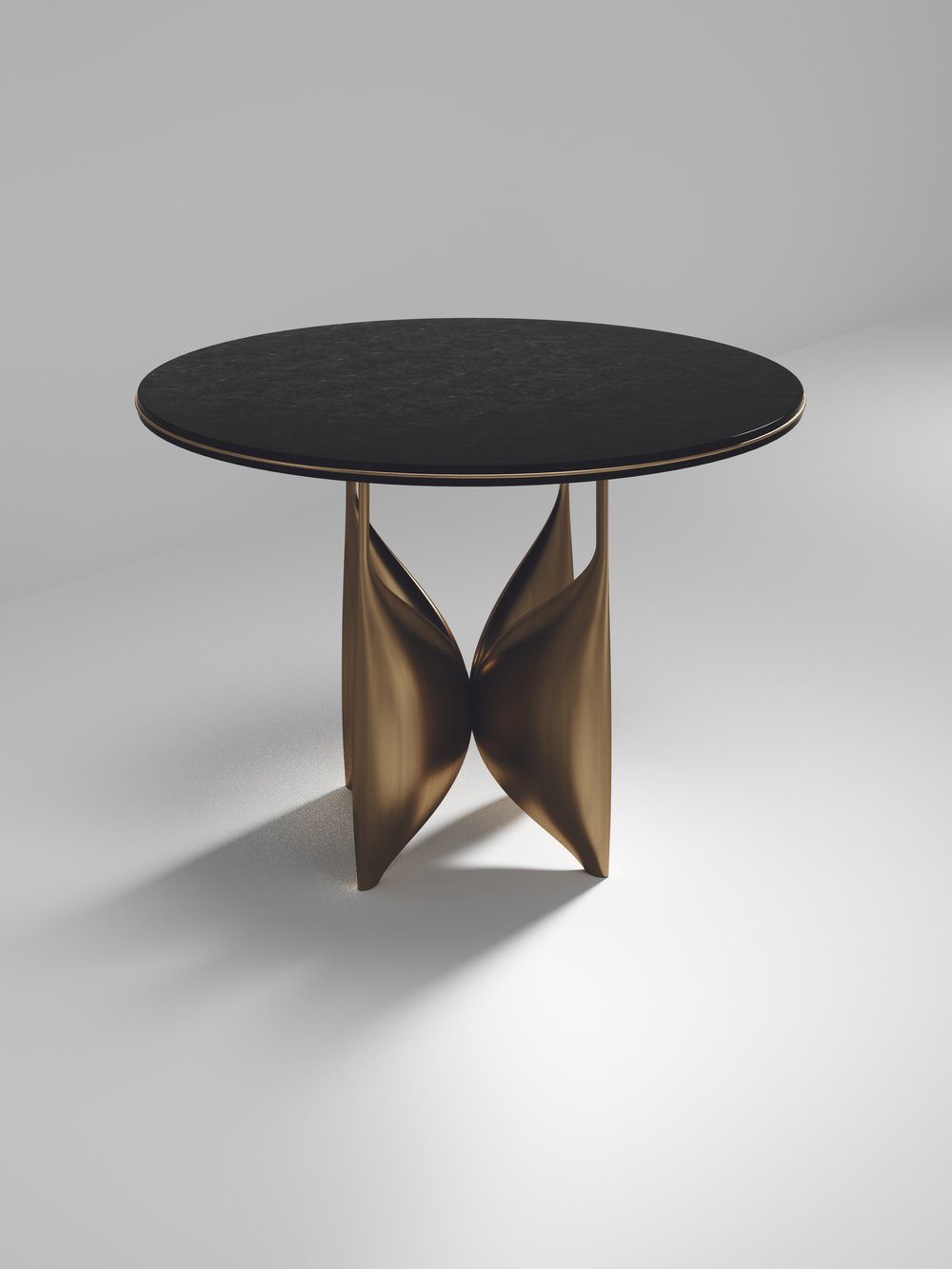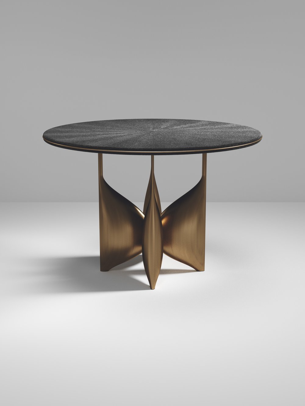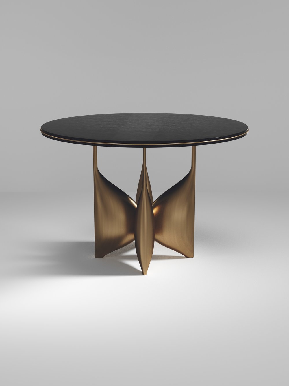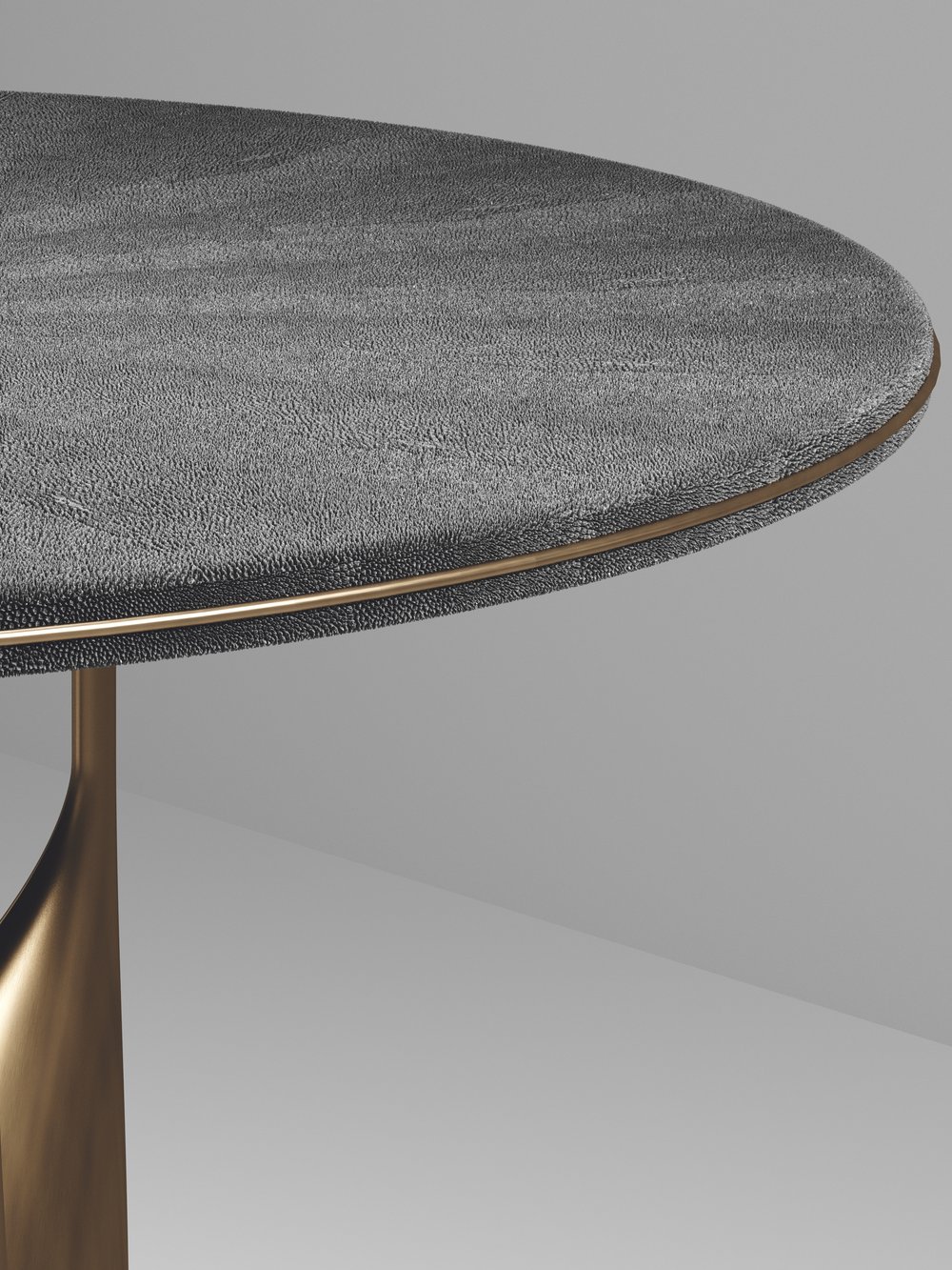 The Plumeria breakast table by Kifu Paris is a dramatic and elegant piece. The cream shagreen inlaid top sits on a sculptural bronze-patina brass base that is conceptually inspired by bird feathers floating on top of a lake. The border of the top is accentuated by a subtle and elegant bronze-patina brass indentation detail. This piece is designed by Kifu Augousti the daughter of Ria and Yiouri Augousti. Available in other finishes. Part of the Plumeria Capsule.
