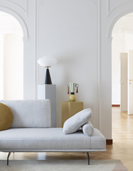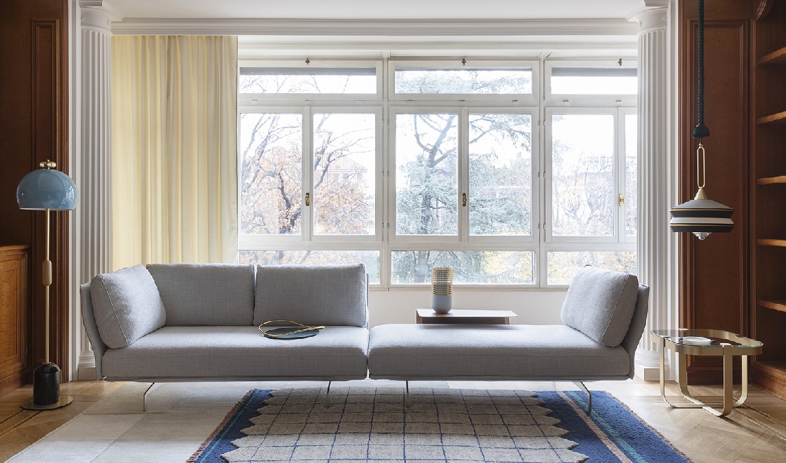 Flow, adapt, create void, rearrange space, receive and renew indefinitely. The new Avant-Après seating is able to do it all. Rigid yet lightweight, the sofa comes in fascinating configurations thanks to the special and unique armrest/backrest system that detaches with a simple movement and may be positioned all along the base. A pre-and-post dance that can be staged every day, created by the desire to try something new. Avant-Après has a sober allure and an elegant appearance. The seating is placed on a metal base upholstered in fabric or leather, resting on metal feet. Refined accessories complete the system: the side tables are walnut wood and come in two different sizes, with the warm notes of the wood. Fully removable covers.