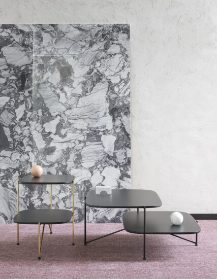 used in building construction that, in this particular context, is interpreted as a joint onto which the feet are attached perpendicularly. This style detail is reminiscent of 1950’s furniture design. The base of the table is painted finished metallic wire drawn and the top in marble.