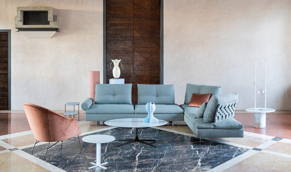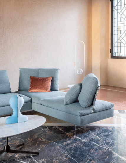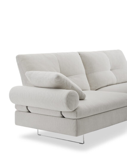 Limes New is a sofa that upholds Saba’s philosophical approach to a larger furnishing project: “Everything slides, everything changes” elaborates Parmenide, who ignited the creative process and guided it through the research phases from the early 2000’s. Limes New is an invitation to go beyond the conventions of predefined space, showcasing how it can become something else altogether simply by moving the back rests. Limes New is a story to tell renewed through sartorial and technical detailing: the asymmetric cut of the back cushions improves support in the lower back. Research into new materials allows the sensation of softness from the goose down filling to come through and guarantees a superior comfort. The volumes have been subtly updated in line with the contemporary aesthetic to include cylindrical armrests in homage to the classic latin heritage. Methacrylate and double depth floating feet.