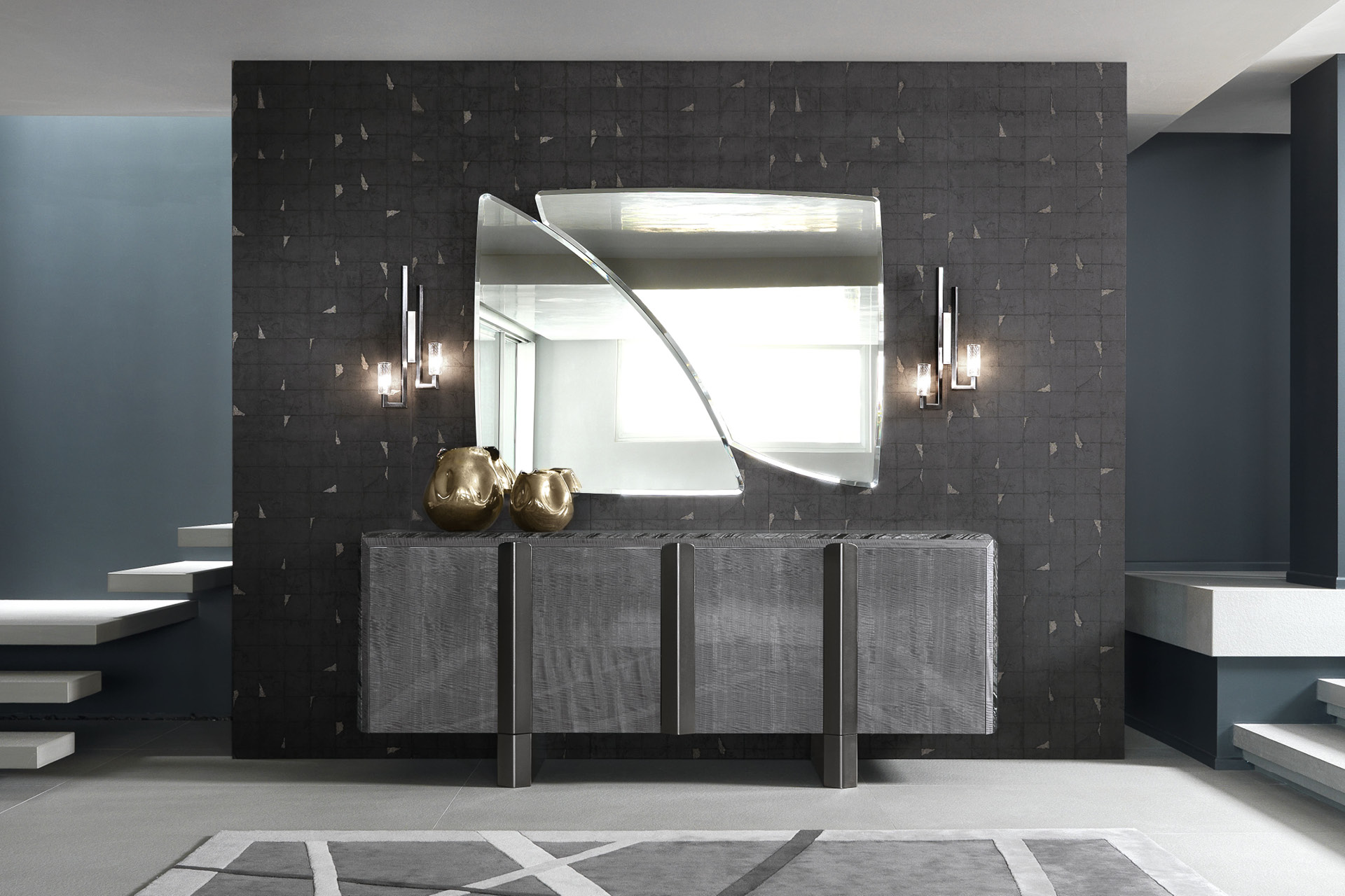 Buffet with 4 doors in Madagascar fìgured Mowinghi veneer with high gloss polyester finish. Top and sides in Kenya Black marble. Base and handles in satin black nickel stainless steel. 1 interior full extension drawer with front in Madagascar figured Mowinghi veneer with high gloss polyester finish, bottom part in velvet fabric. 3 adjustable glass shelves.
