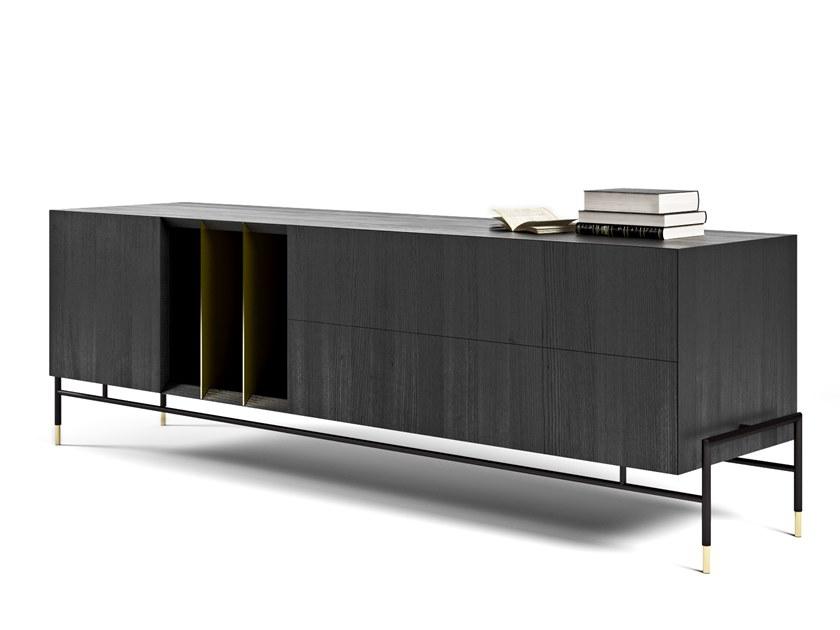 Sideboard, cm 230x55x72h Structure in veneer Ash laquered col. black Open pore, magazine rack in light gold, metal base matt black, feet in light gold finish x55x72h Structure in veneer Ash laquered col. black Open pore, magazine rack in light gold, metal base matt black, feet in light gold finish