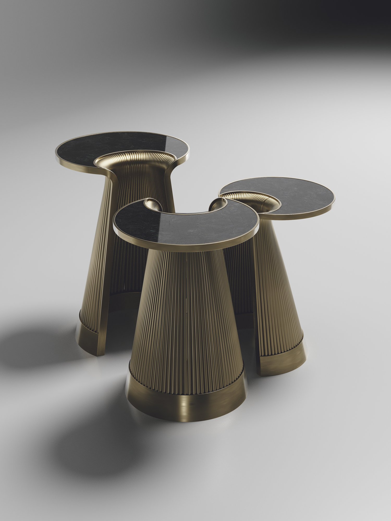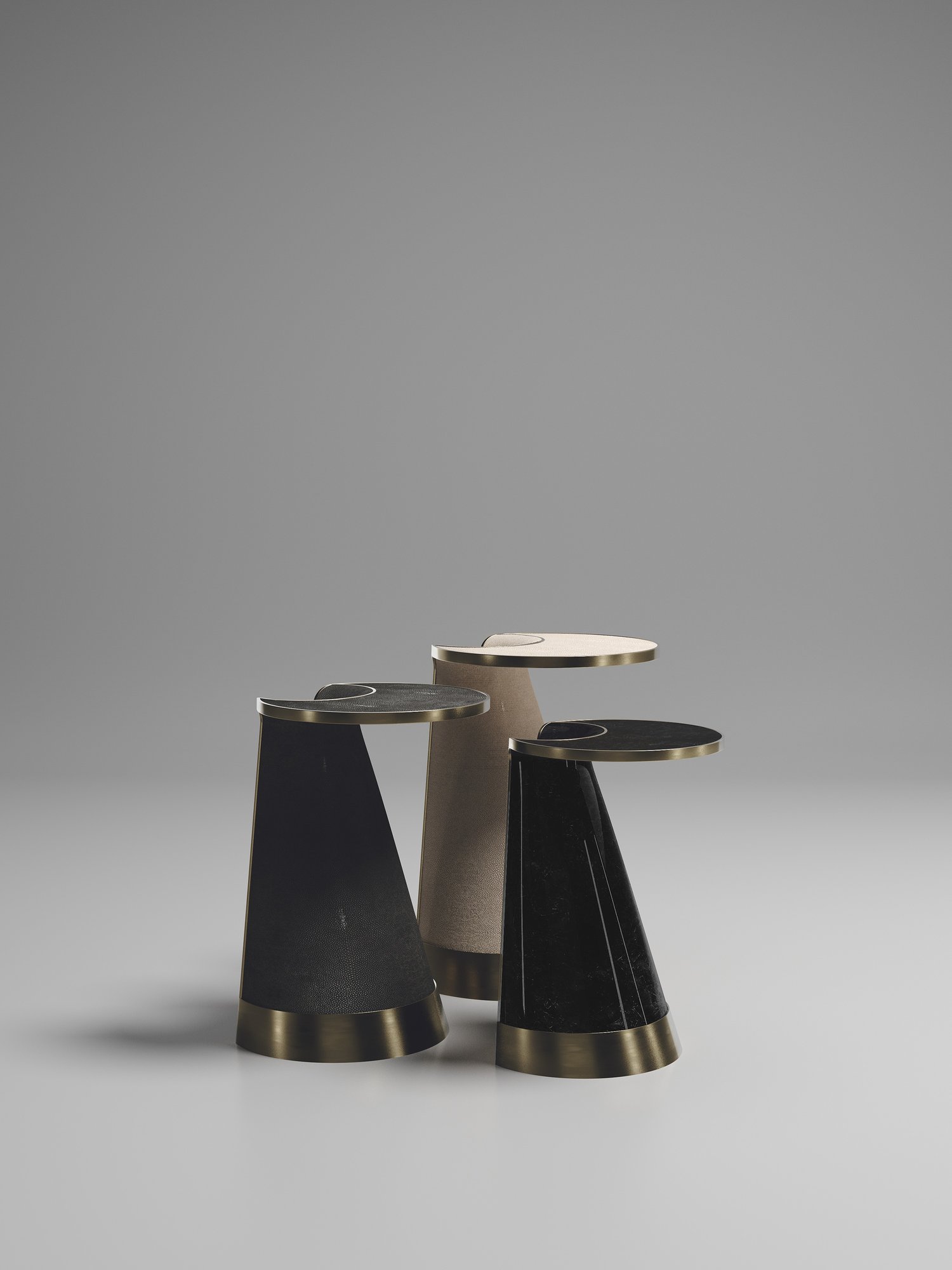 The Nymphea set of 3 nesting side tables by R & Y Augousti explore the brand's iconic DNA of bringing old world artisanal craft into a contemporary and utterly luxury feel. These pieces are done in different finish variations including shagreen, pen shell with bronze-patina brass accents. This listing is for the set of 3 nesting tables, the pieces are available to purchase individually on request. Custom sizing/finishing on request.