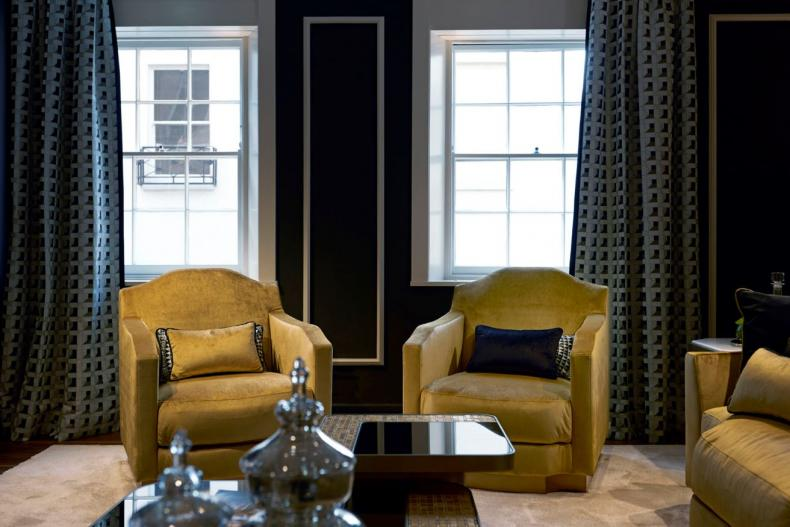 Inspired by the Palladian style, it has a rigid structure upholstered in fabric and slender wooden feet. Jacquard woven fabric upholstery on the seat complete this elegant armchair.