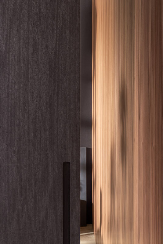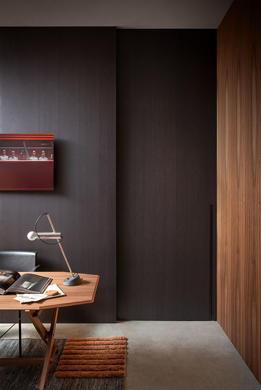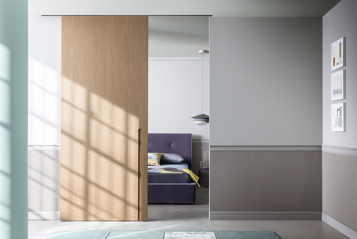 La porta per interni esterno muro Drive è un sistema combinato di porta scorrevole e di binario telescopico predisposto per essere installato direttamente a parete. Può leggersi come una superficie appoggiata alla parete.