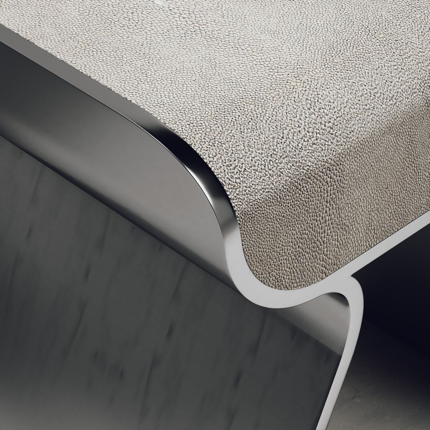 The dandy stool inlaid in cream shagreen is a chic seating piece for any space. The sides of the pieces are completely inlaid in polished steel adding another luxurious and modern element to the piece. Available in other finishes and as a bench, see images at end of slide. This piece is designed by Kifu Augousti, the daughter of Ria and Yiouri Augousti.