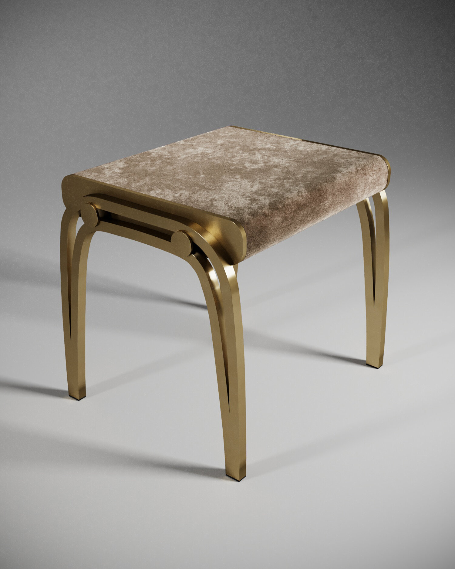 The limited edition Victoria stool by R&Y Augousti is a sophisticated piece that provides comfort, whilst retaining its elegant and luxurious aesthetic. The seat is upholstered in a creamy taupe, black, mustard, pink, green, or blue Pierre Frey Velvet, with a bronze-patina brass frame. This stool is a part of a 4-piece limited edition capsule collection by R&Y Augousti.