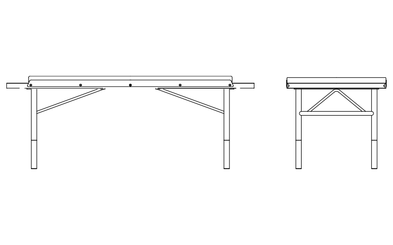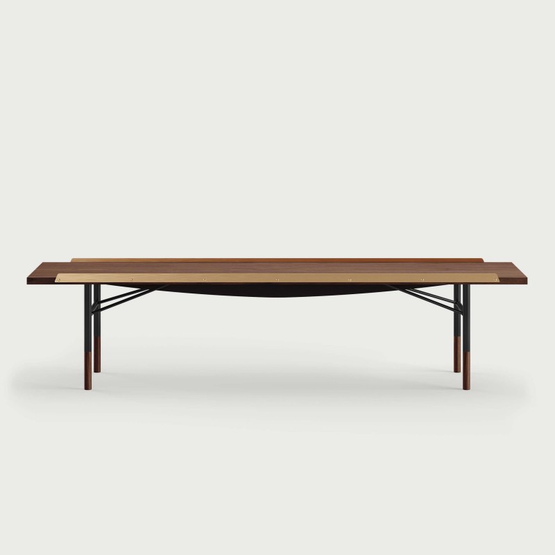Materials: Teak, oak, walnut, Oregon pine veneer or black linoleum and matching wooden toes. Legs in burnished or painted steel in black, orange or light blue. With or without brass edges. With or without cushion in textile or leather.