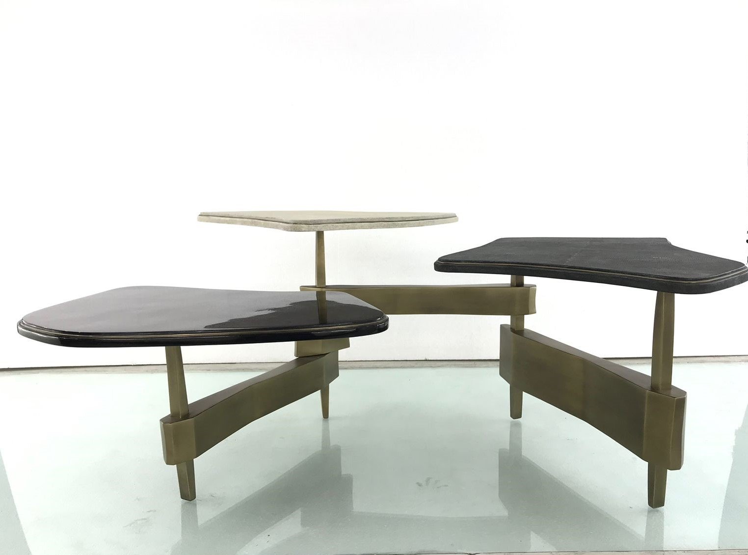 The Metropolis 3-top coffee table by Kifu Paris is a dramatic and sculptural design that demonstrates the incredible and signature artisanale work from her Augousti genes. The bronze-patina brass base of the coffee table is conceptually inspired by the skyline of cosmopolitan cities. The tops are inlaid in a mixture of cream shagreen, black Shagreen and black pen shell with a subtle metal indentation detail. This piece comes as a console table and side table variations.