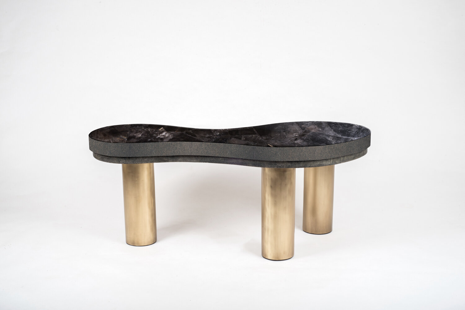 The constellation coffee table is whimsical and elegant with its galactic inspired shaped. This piece can also double as a bench. The top is inlaid in a beautiful Black Quartz semi-precious stone that has incredible tonalities in it and details. The shagreen inlaid side border is hand-dyed by artisans and the designer calls the final finish “coal black” shagreen. The table sits on three bronze-patina brass tubular legs this piece is designed by Kifu Augousti, the daughter of Ria and Yiouri Augousti. Available in different finishes and with a pattern inlay.